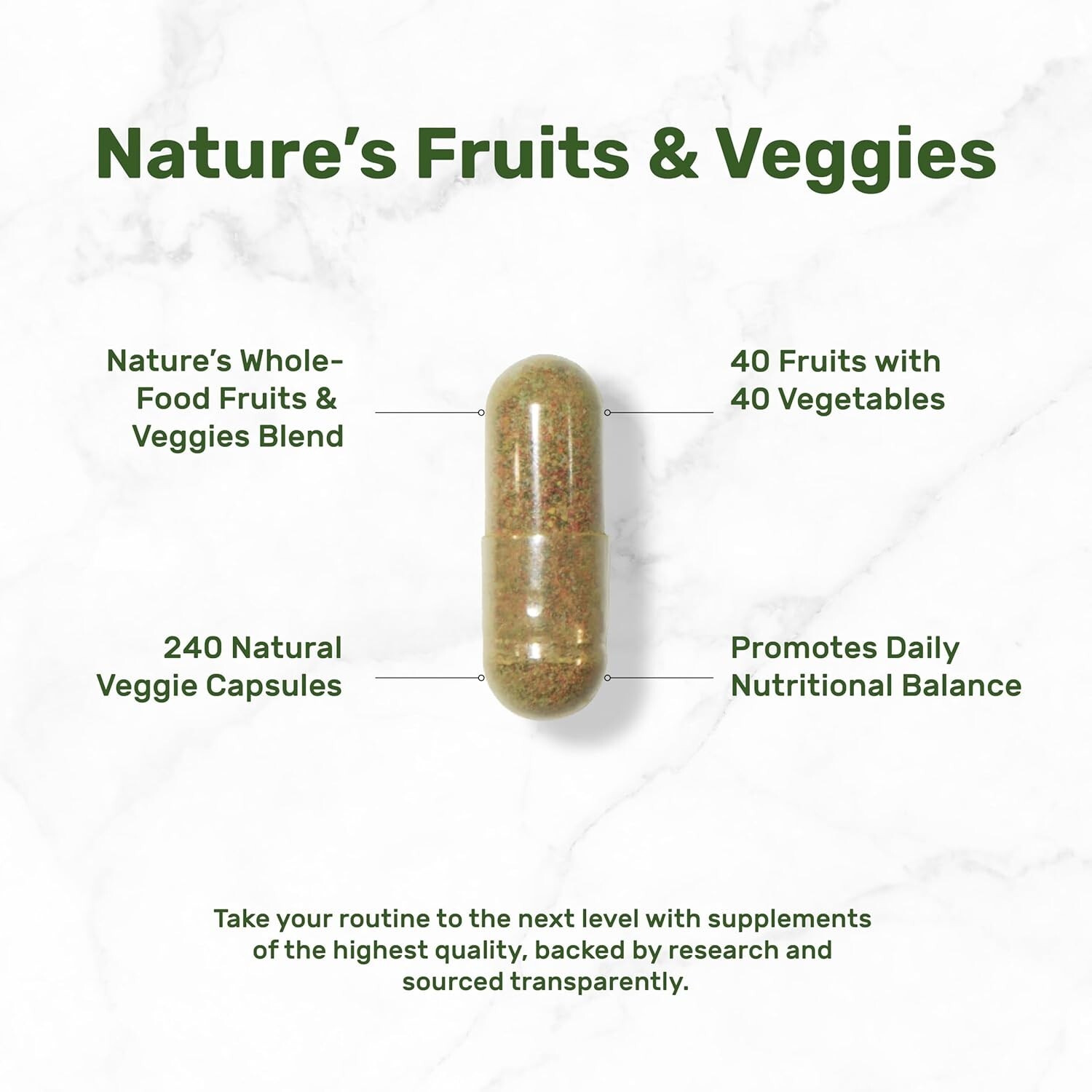 Special Features – Nature’s Fruits & Veggies whole food supplement. 240 veggie capsules packed with 80 fresh superfoods. Retains natural vitamins, minerals, phytonutrients, and antioxidants.