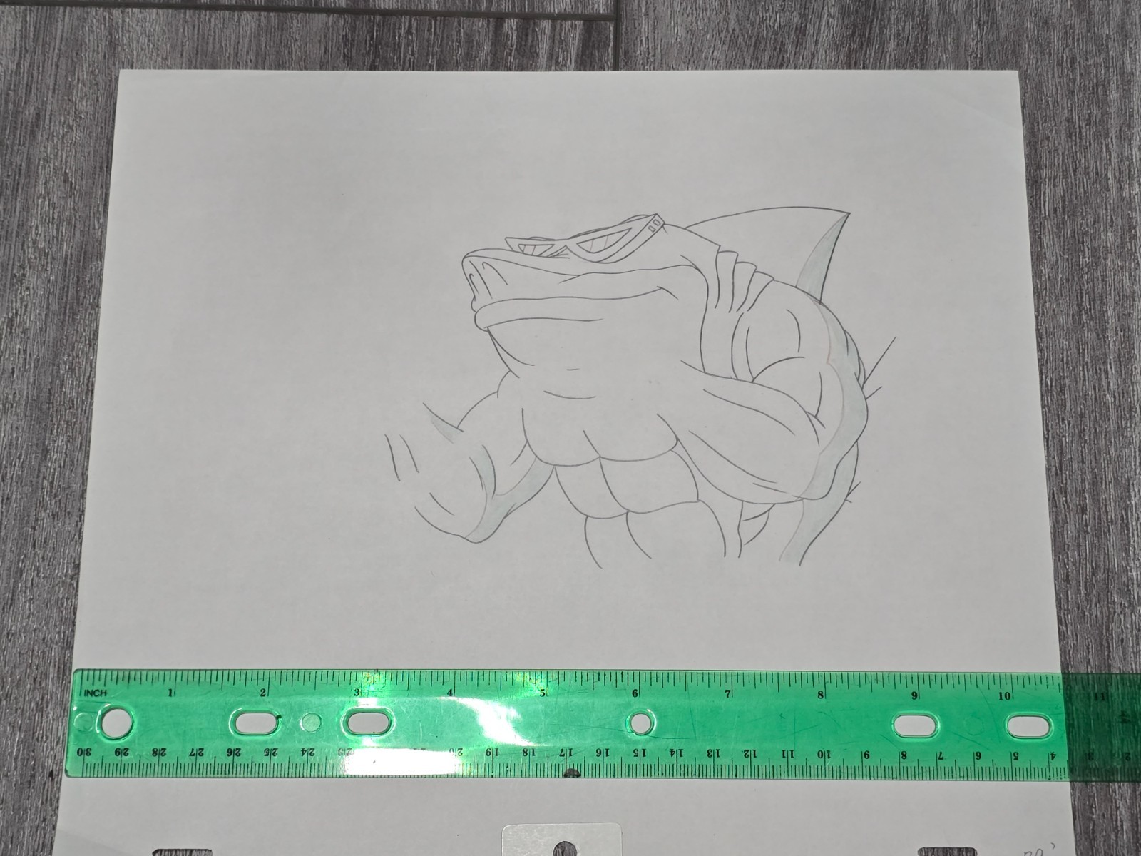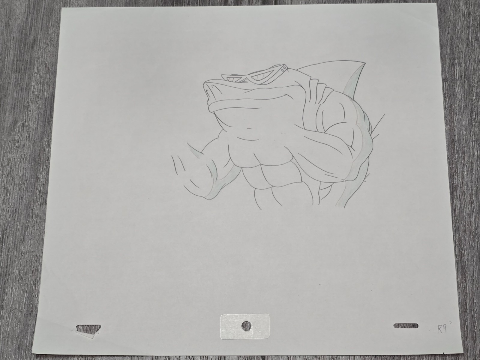 Details: This is an authentic piece of animation production art used in the making of the cult 1990s cartoon Street Sharks. The sketch features one of the iconic anthropomorphic sharks, shown in muscular detail with sunglasses.