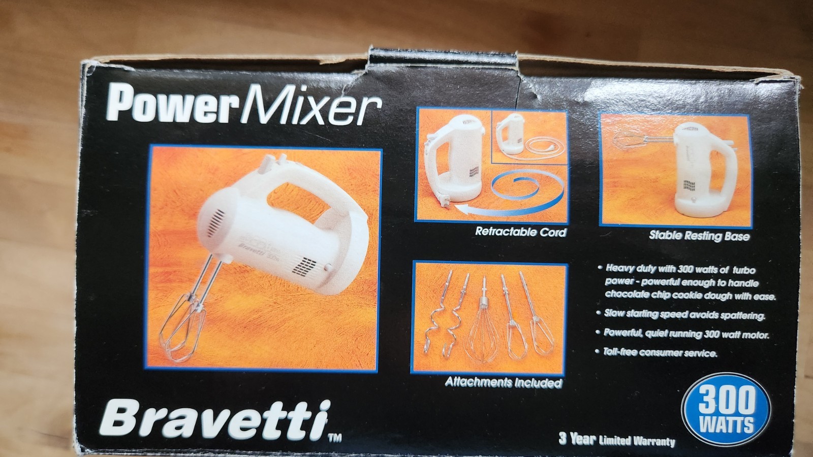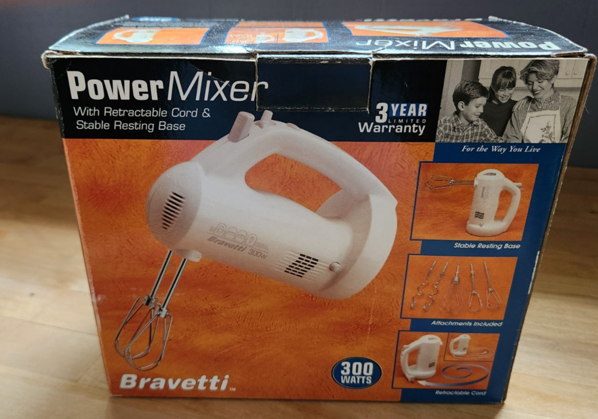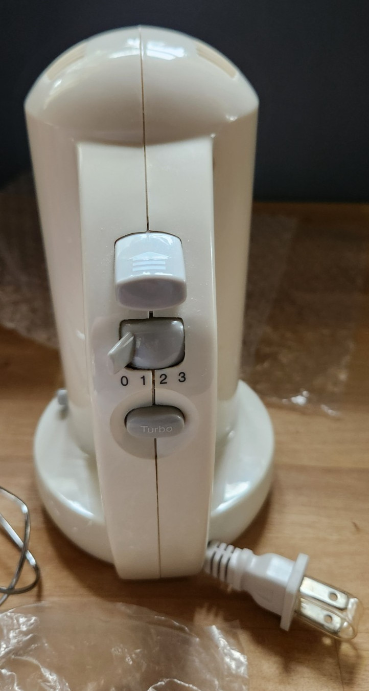 Mixer may have been used once or twice, but doesn't show much evidence. Powers on, runs and cord retracts. Nice condition with all attachments, instructions and storage bag. Please examine all photos closely and feel free to contact me with any questions or offers.