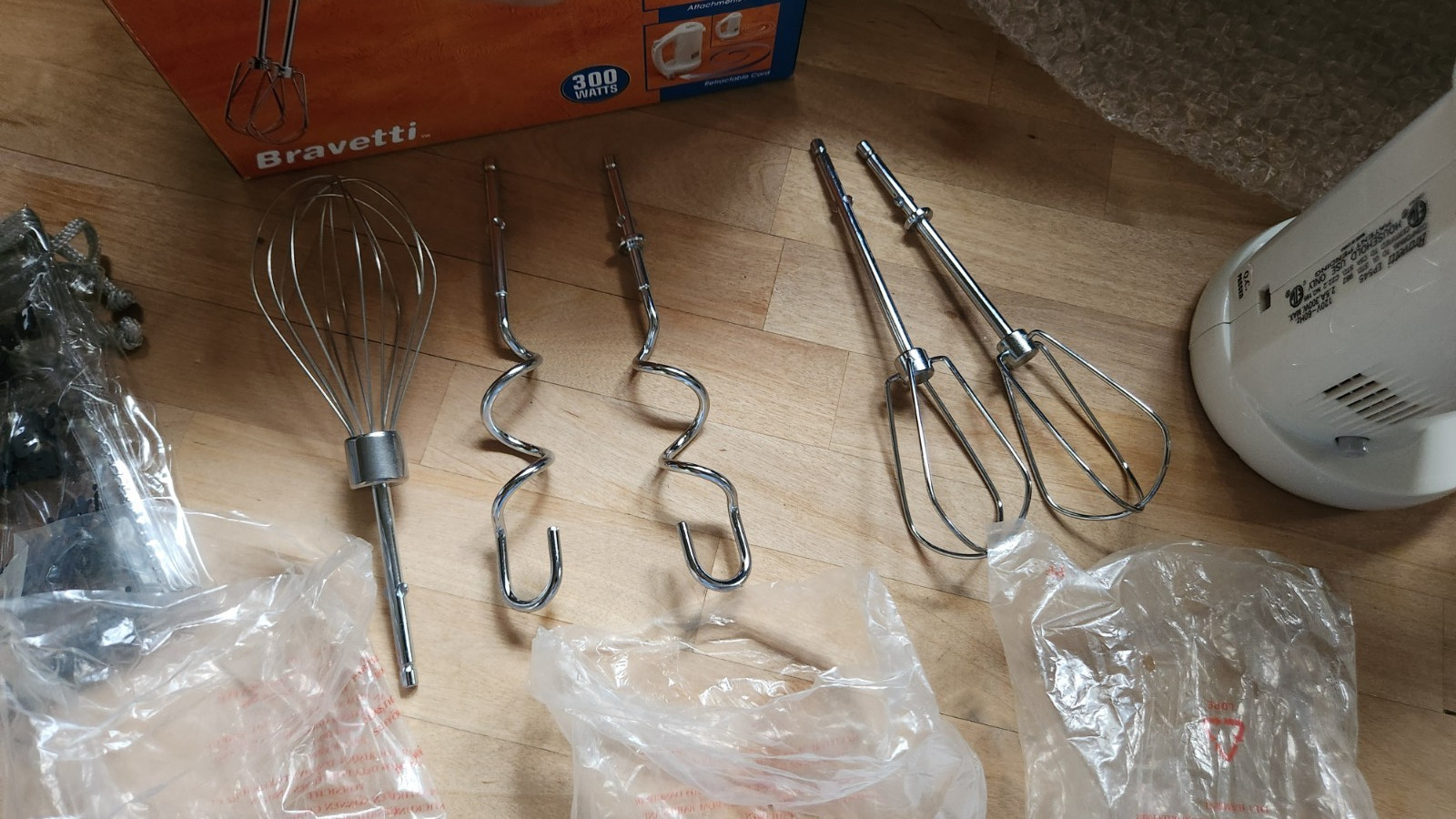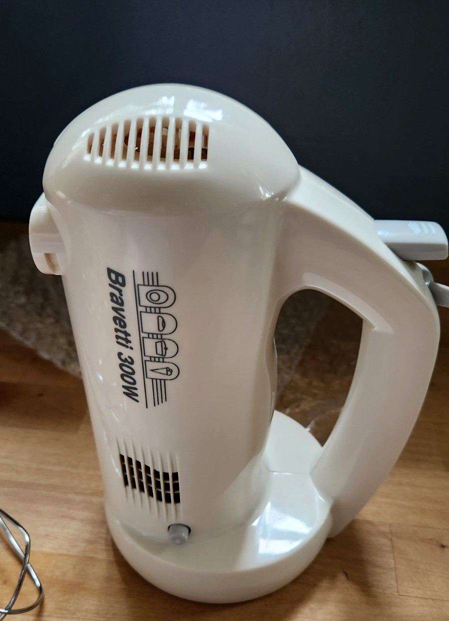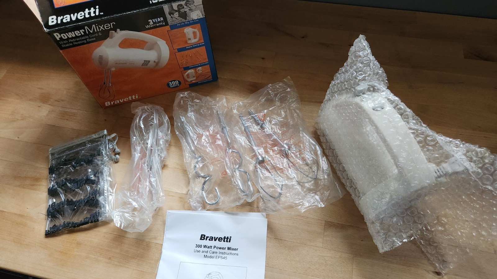 Mixer may have been used once or twice, but doesn't show much evidence. Powers on, runs and cord retracts. Nice condition with all attachments, instructions and storage bag. Please examine all photos closely and feel free to contact me with any questions or offers.
