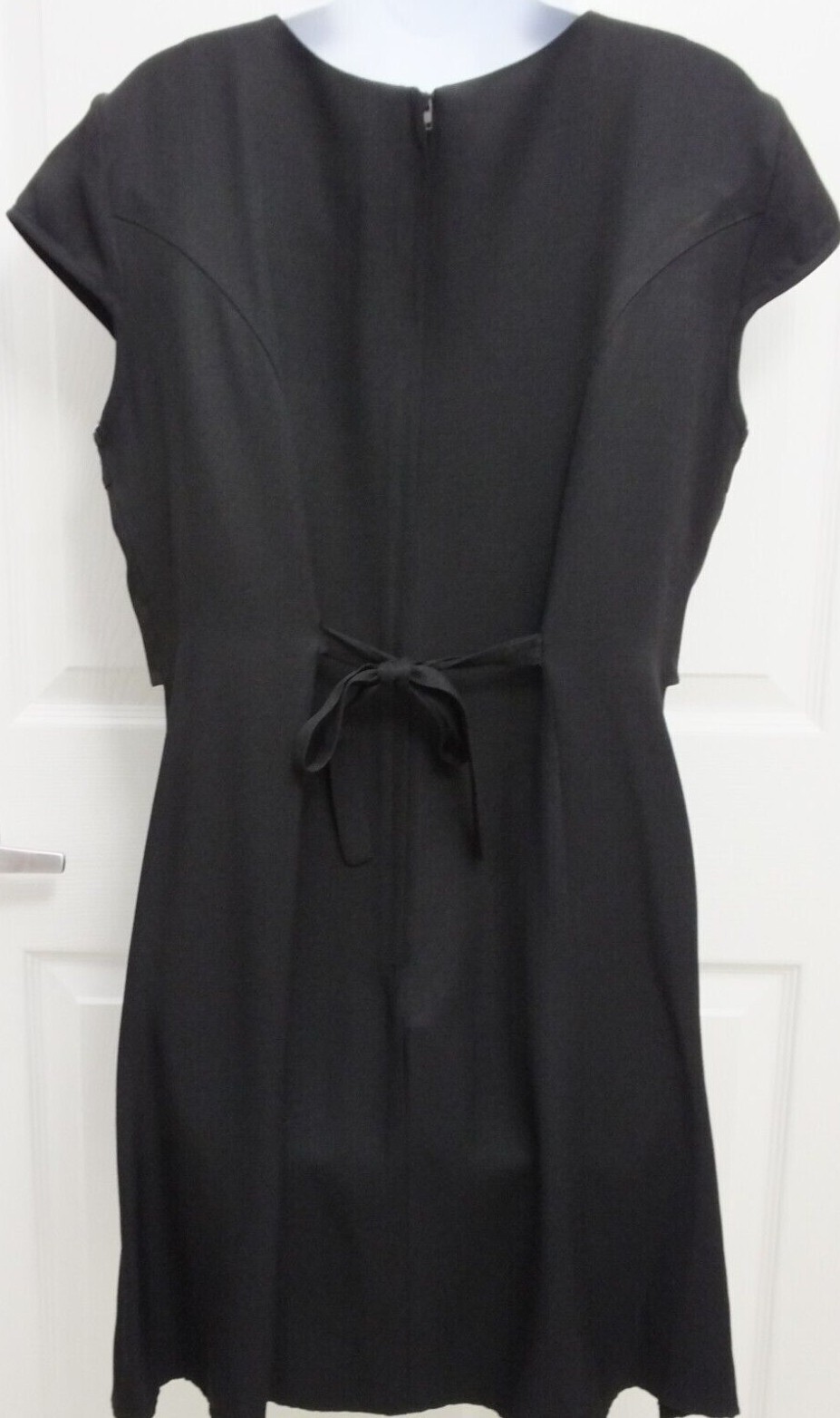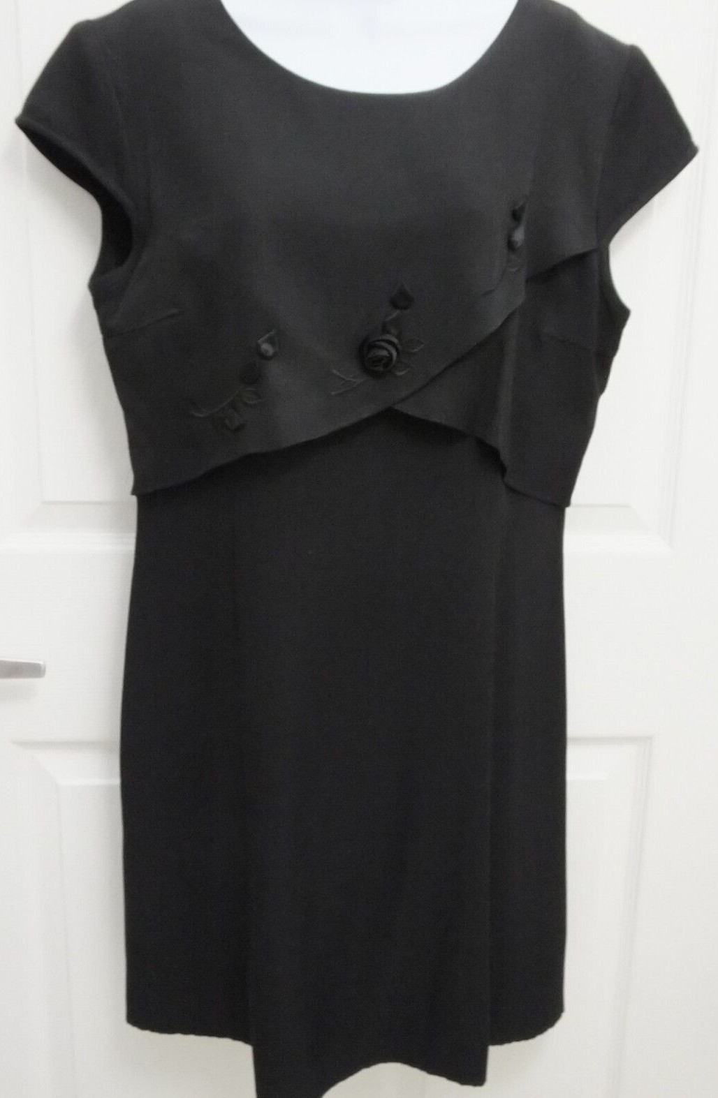 Adorable Style. This is a Just Choon black dress with raised roses and leaves which are on a panel that overhangs the skirt portion of the dress. This is a size 13 junior. The dress falls just above the knee on a petite woman and a little shorter on a regular size. It would make a great cocktail or evening dress or wear it as a top over tights. There is zipper on the back and also 2 ties that can be tied in a bow or knot. The length from the top of the rear of the neck to the bottom of the dress hem is 33 inches. The dress has very small cap sleeves on each shoulder.