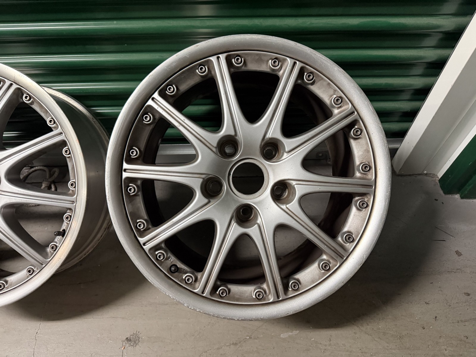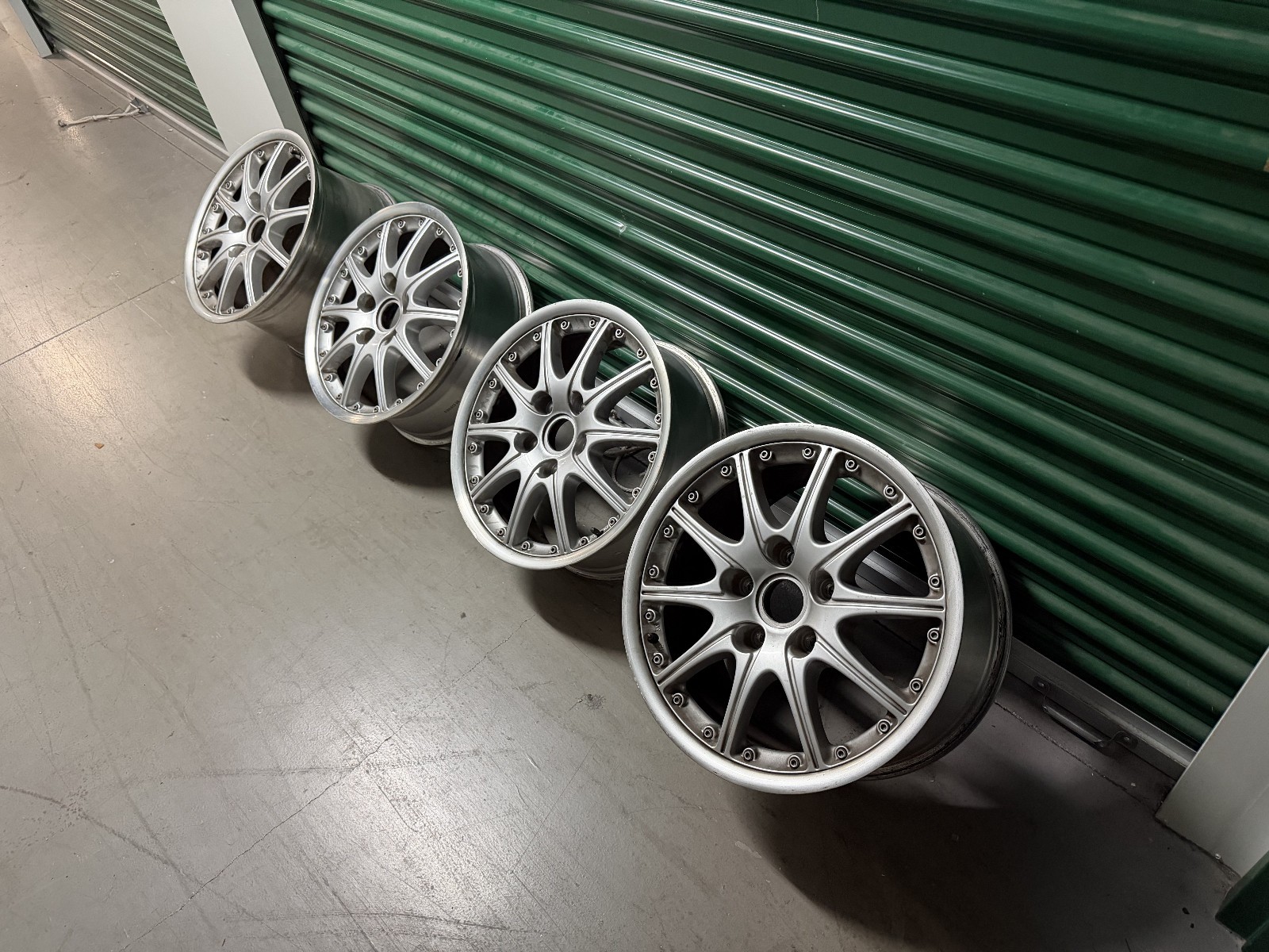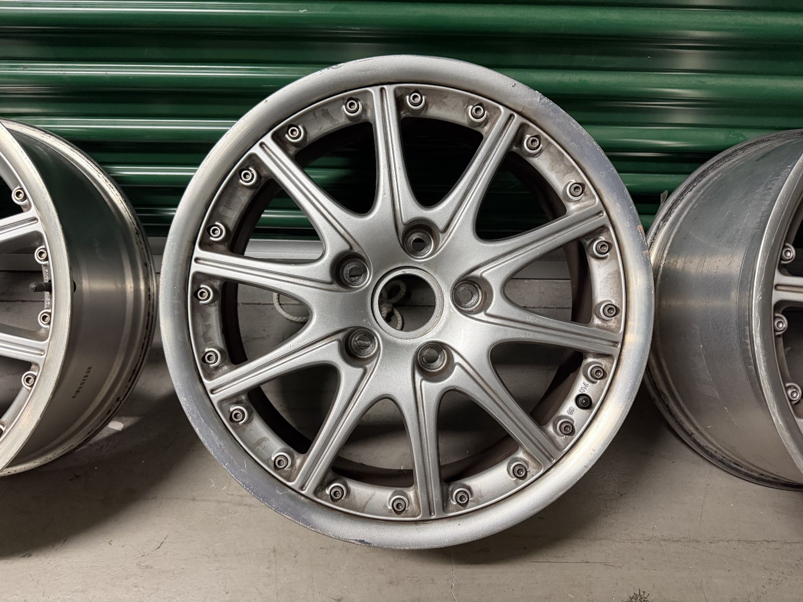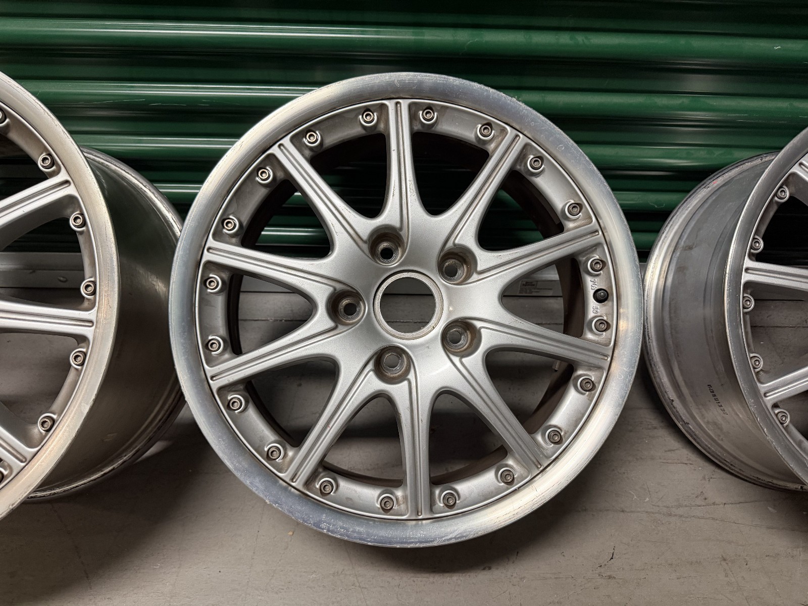manufactured by BBS for Porsche. The wheels feature silver paint, 10-spoke centers, and machined lips. Casting marks include part numbers, manufacturer logos, sizing, and production dates.