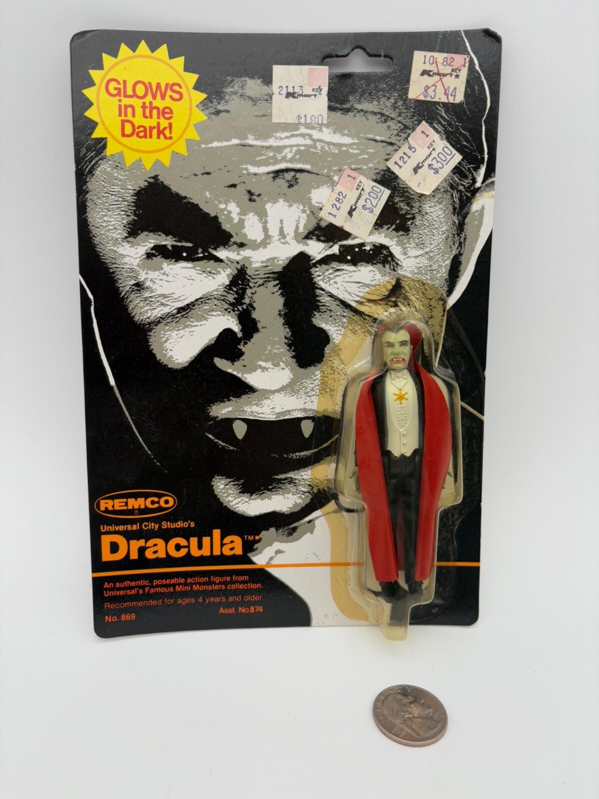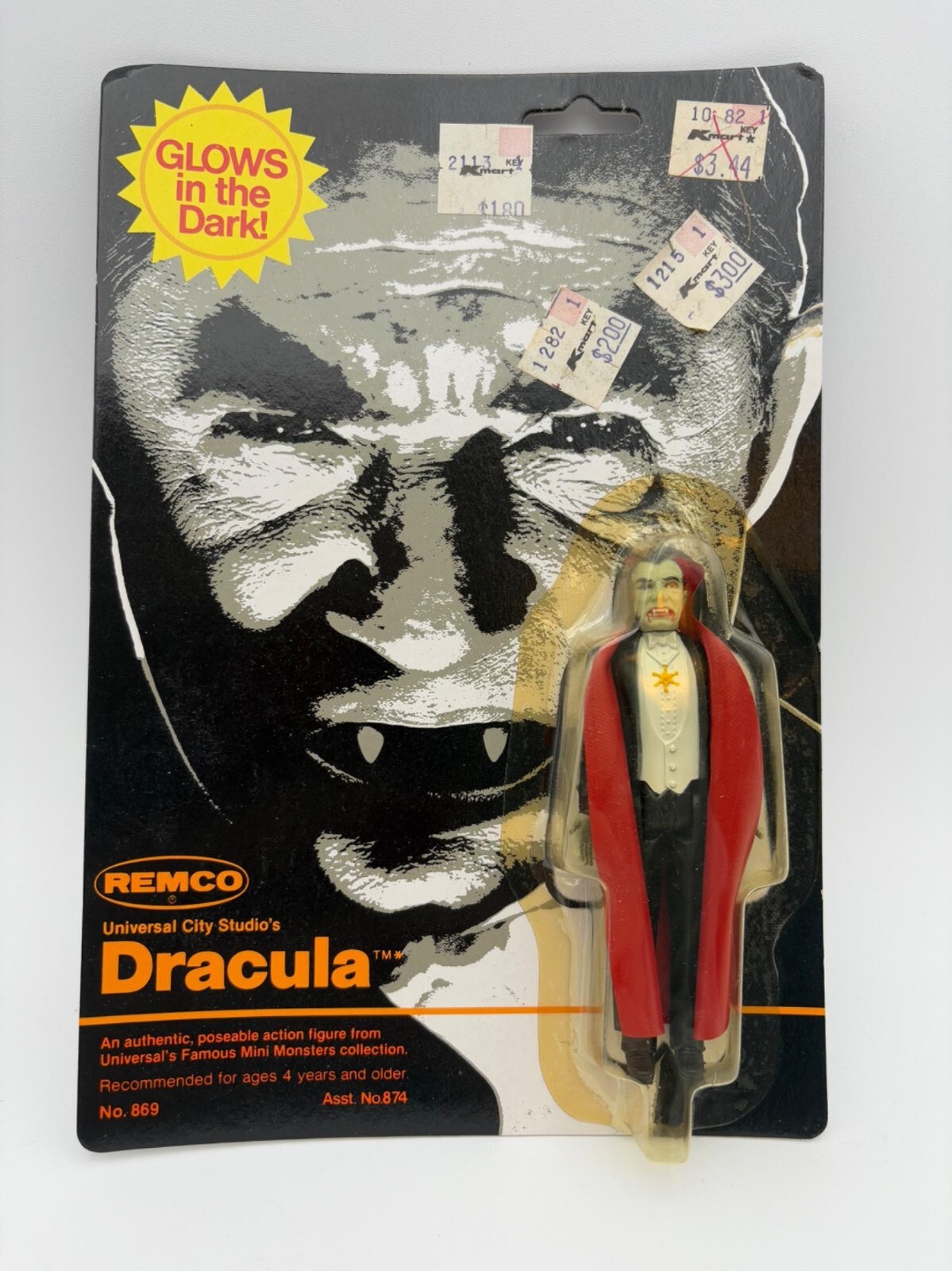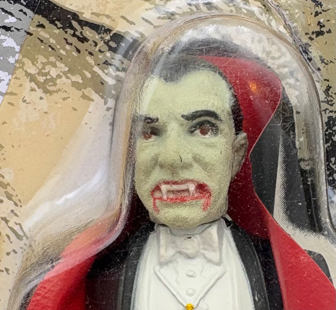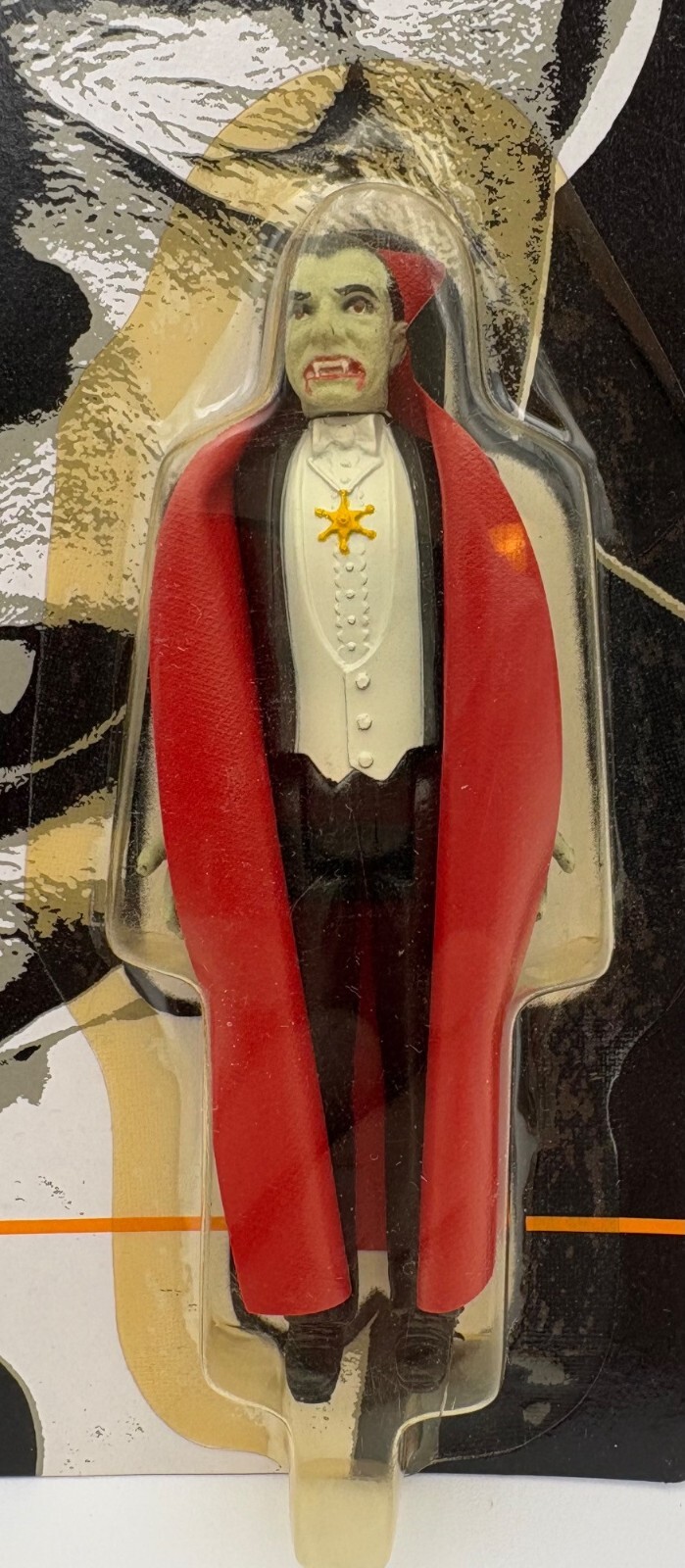 Remco’s terrific small Dracula action figure. From “Universal’s Famous Mini Monsters Collection” (Model #869, Assortment #874). From 1980. Black overcoat with red lining/ white vest and off-green skin, moveable legs, arm, & head. Glows in the dark! New in original packaging with no noticeable flaws except slight yellowing of plastic shell from age – see photos. Measures approx. 4” H.