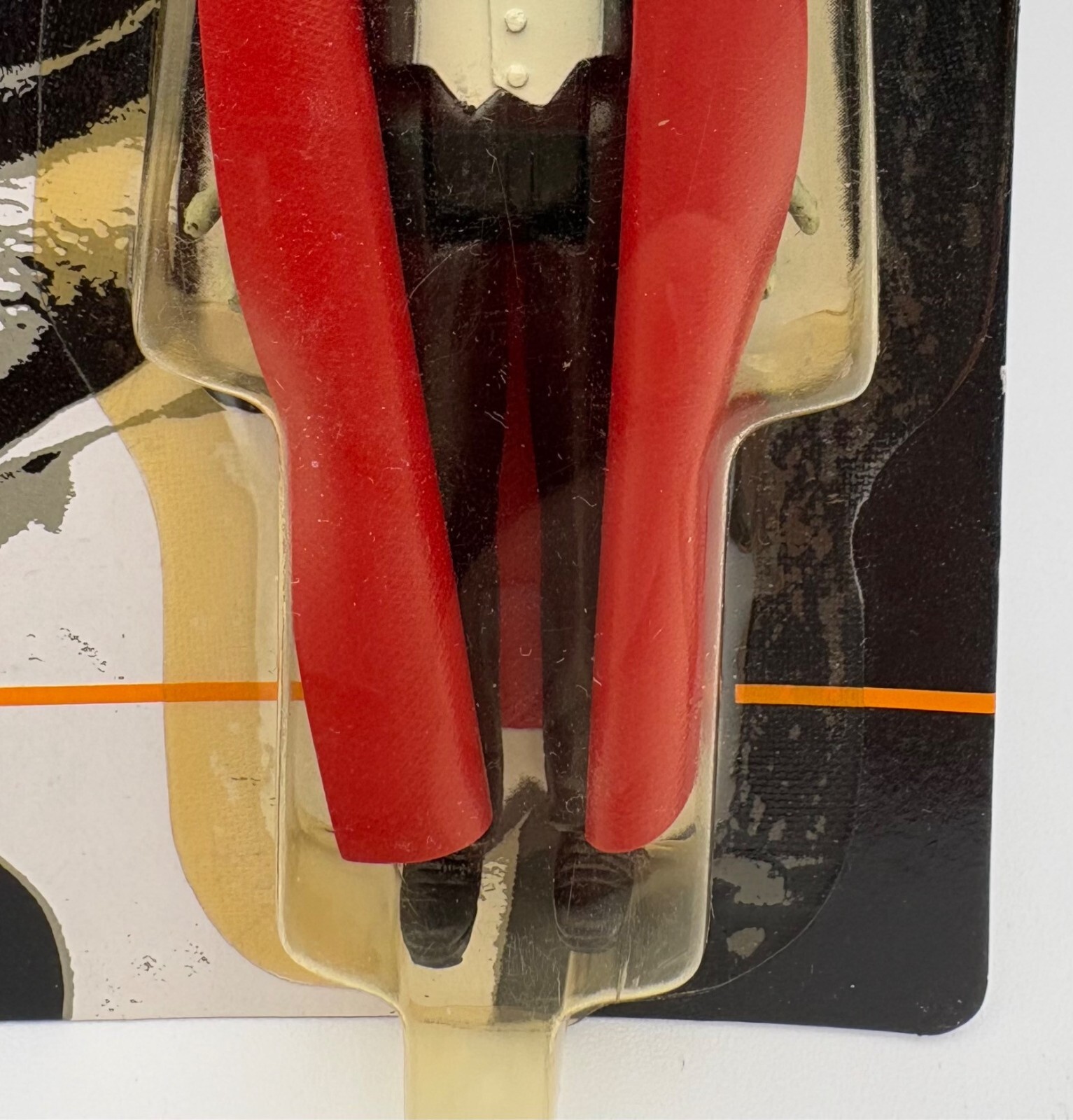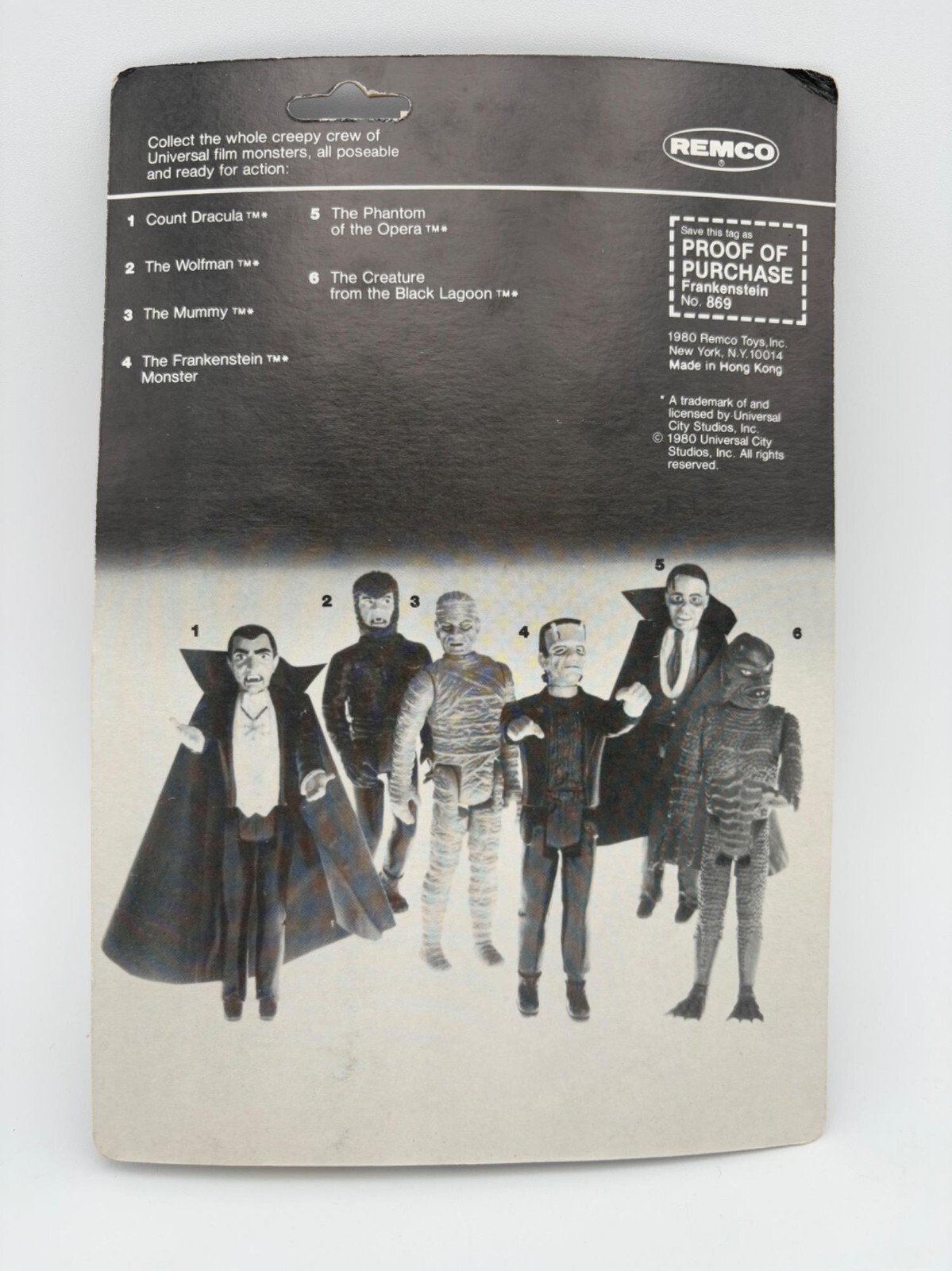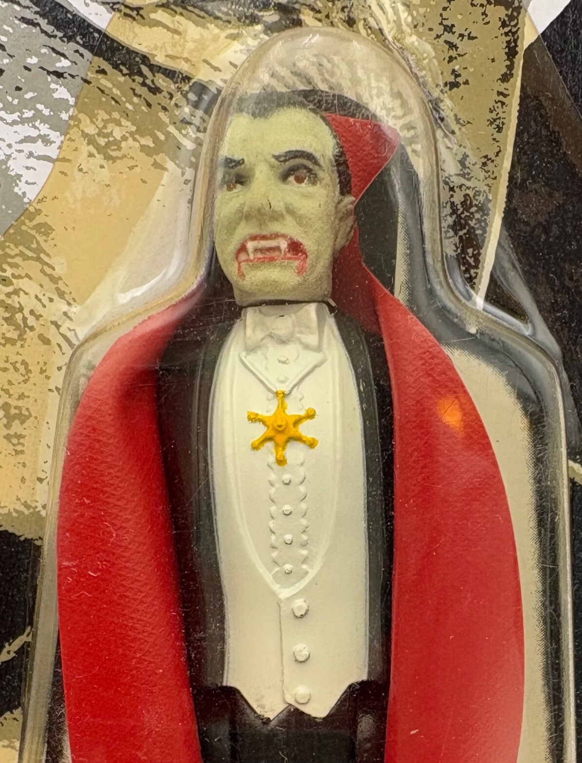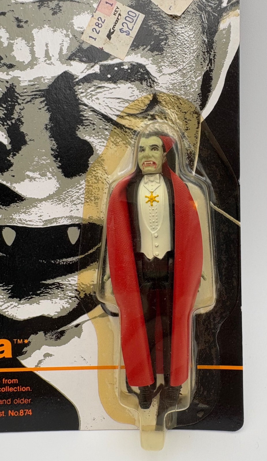 Remco’s terrific small Dracula action figure. From “Universal’s Famous Mini Monsters Collection” (Model #869, Assortment #874). From 1980. Black overcoat with red lining/ white vest and off-green skin, moveable legs, arm, & head. Glows in the dark! New in original packaging with no noticeable flaws except slight yellowing of plastic shell from age – see photos. Measures approx. 4” H.