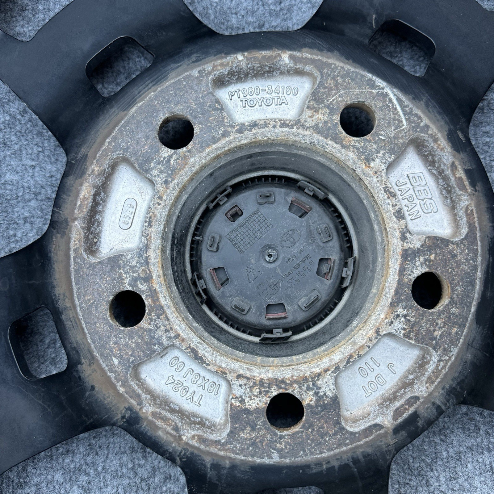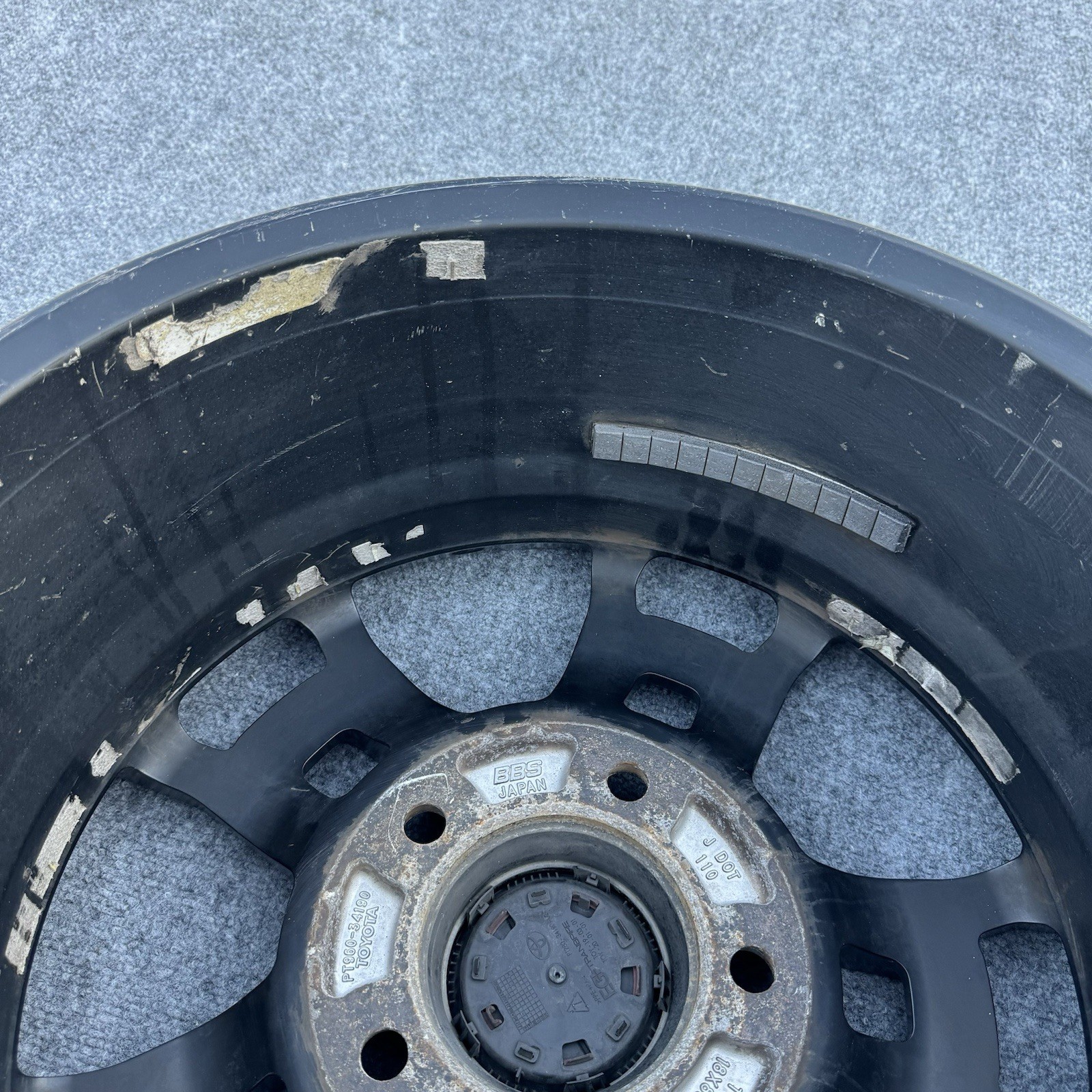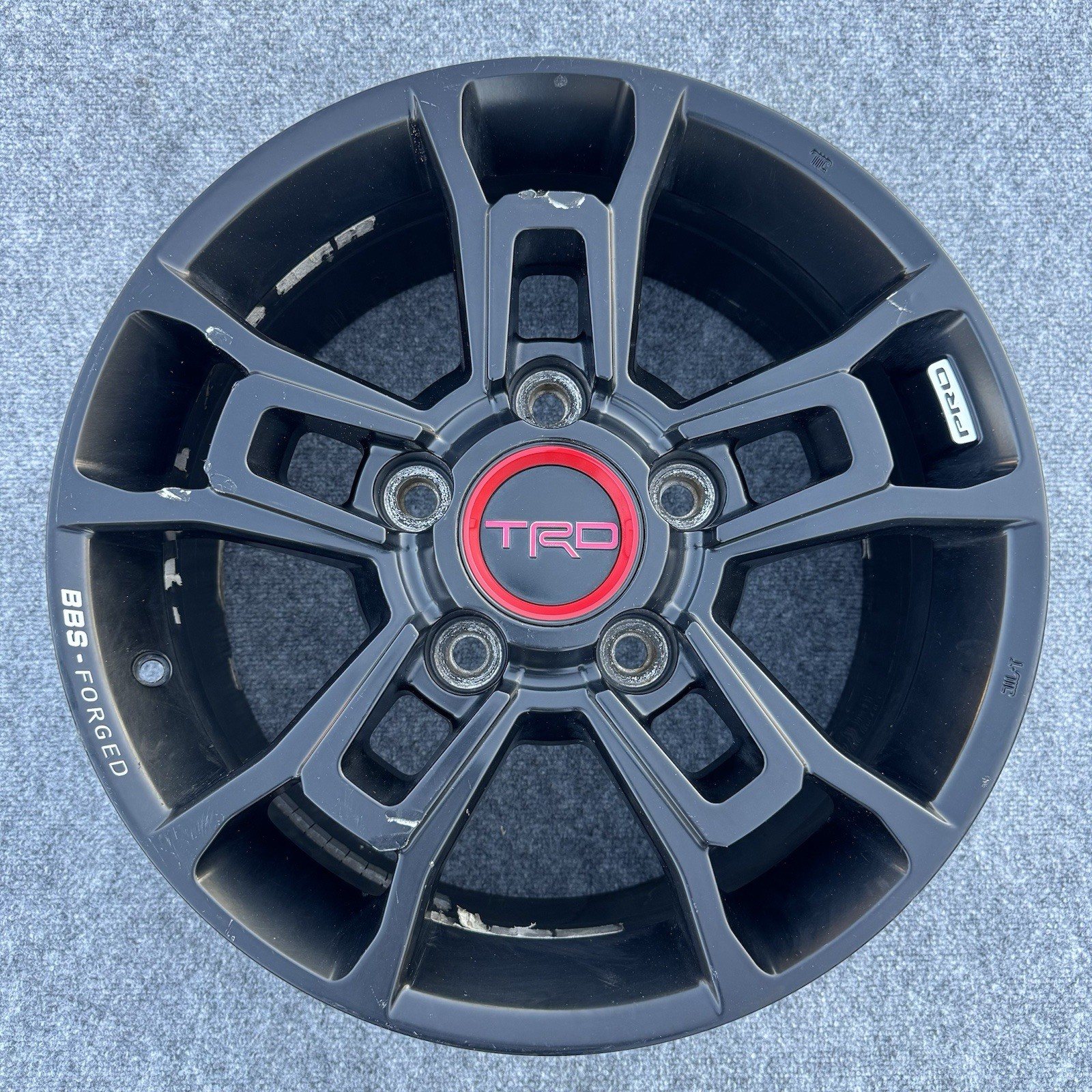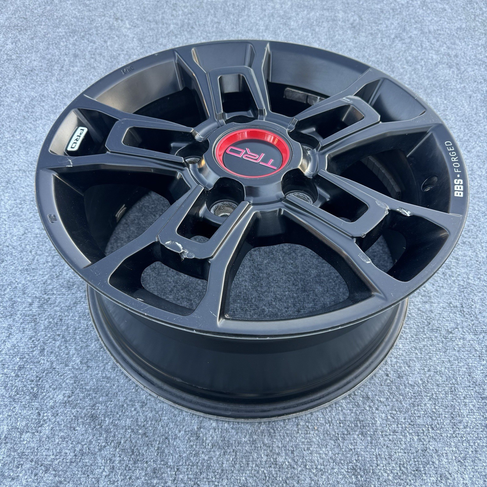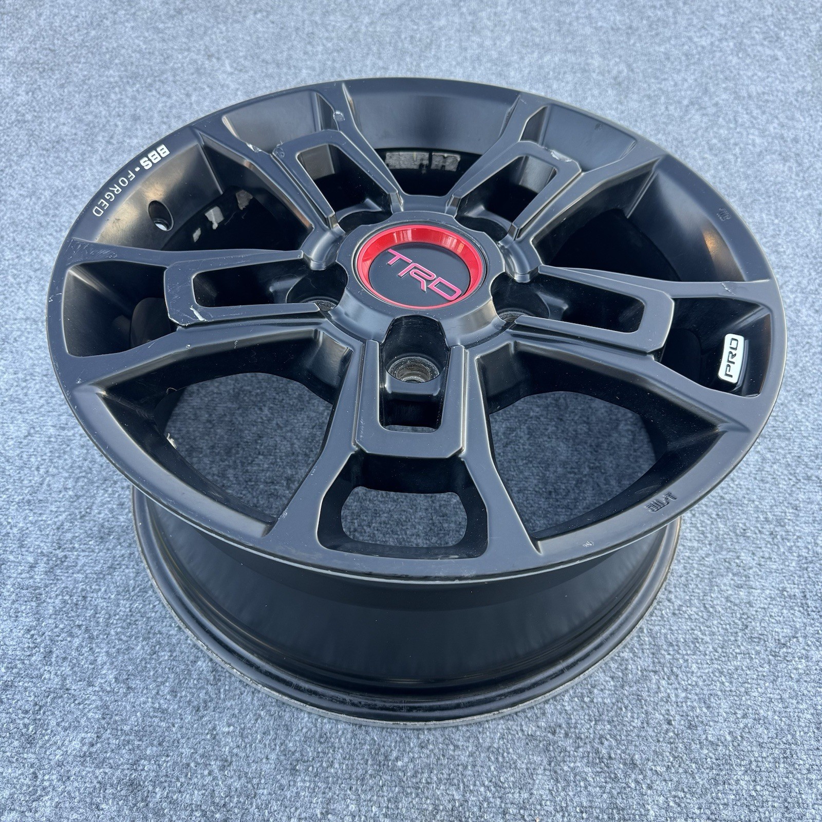 Toyota TRD PRO Tundra and Sequoia BBS Matte Black Forged 1 Wheel Factory OEM. Used condition with some wear, scratches, imperfections as per photos. Some dings/gouges noted in areas of the spokes. The wheel was tested on the balancer and looked to be straight. Will need a new valve stem/TPMS. Please match up the part numbers to ensure fitment. Please see all photos for details.