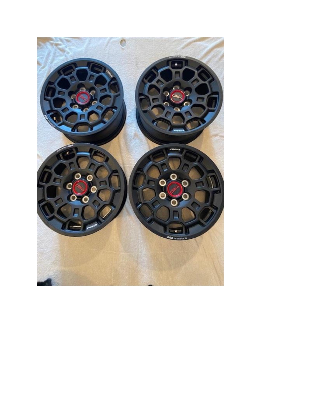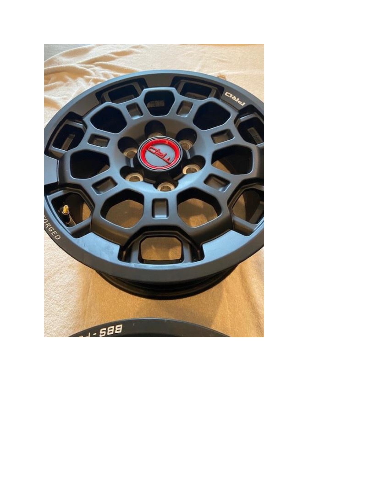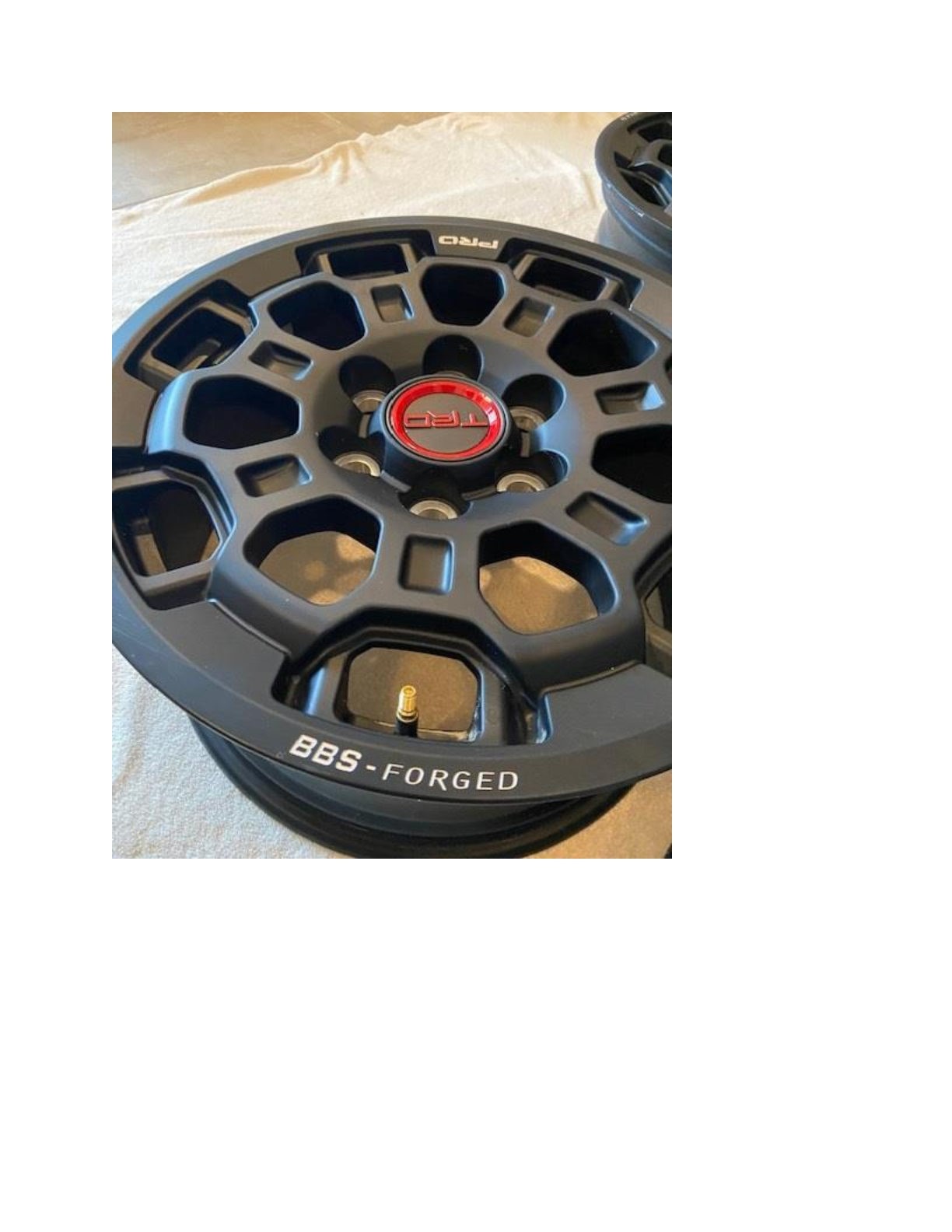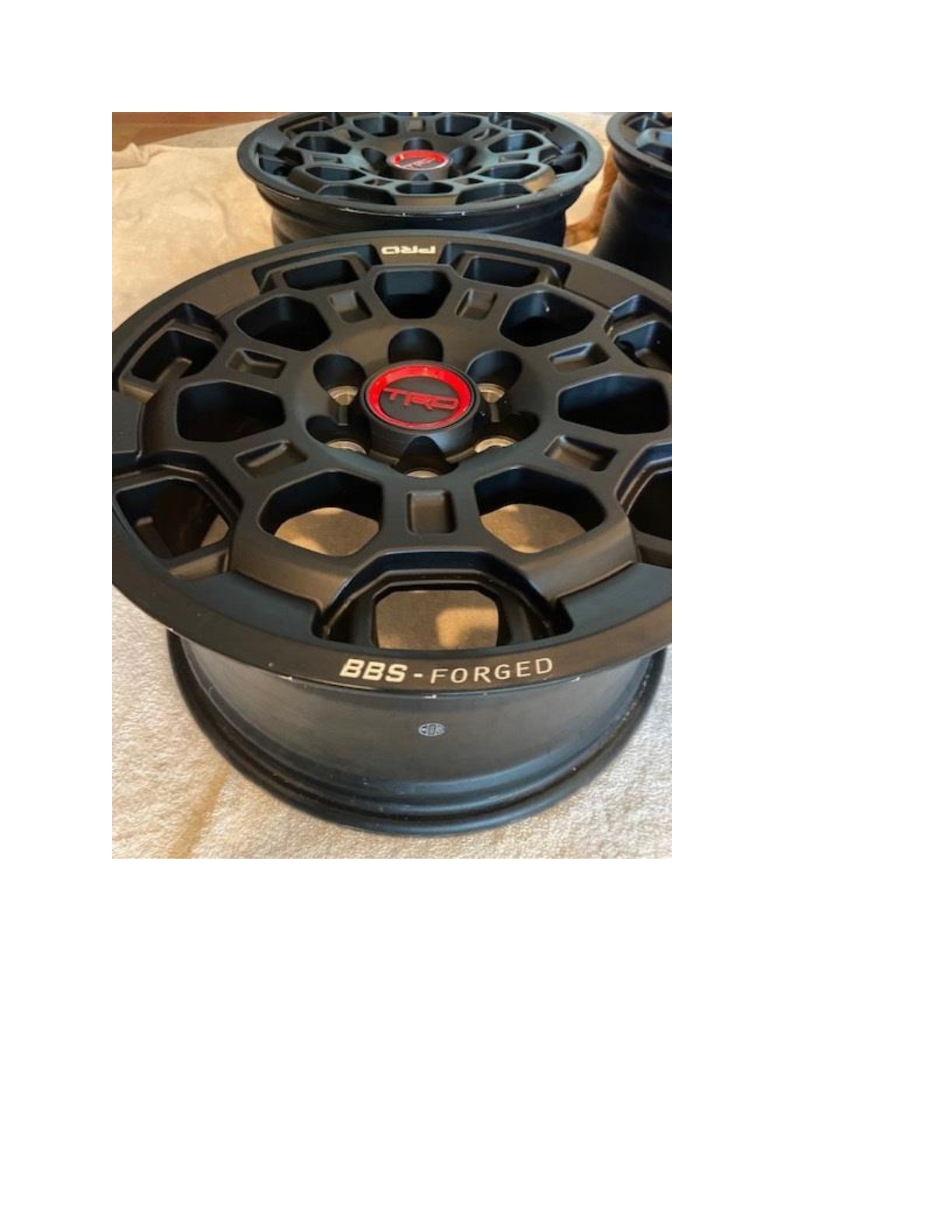 For sale isa set of genuine OEM TRD Pro BBS forged wheels in matteblack. These wheels were taken off a 2026 Toyota Tundra TRD Pro and have approximately 2,500 miles on them. 2 of the wheels are near perfect, and the other 2 have some very light scratches(surface only) near far outer edge of the wheel which were caused by the tires being removed.