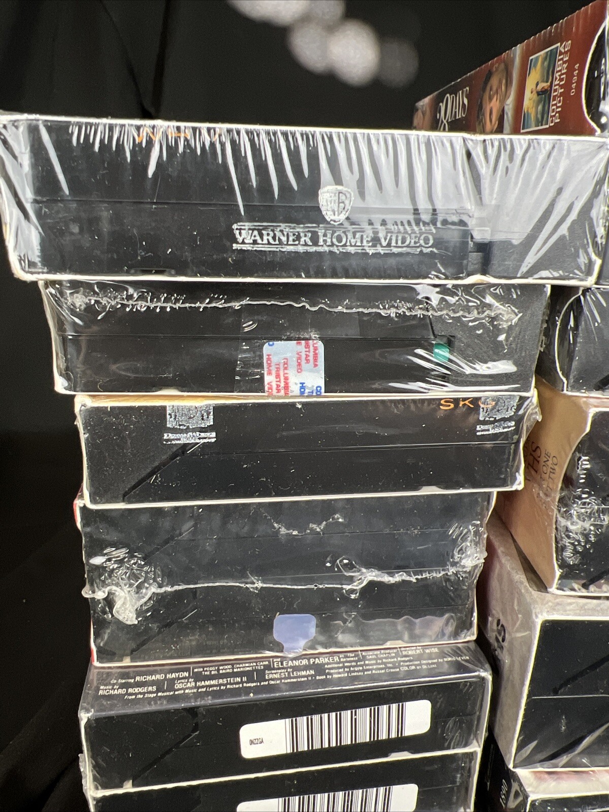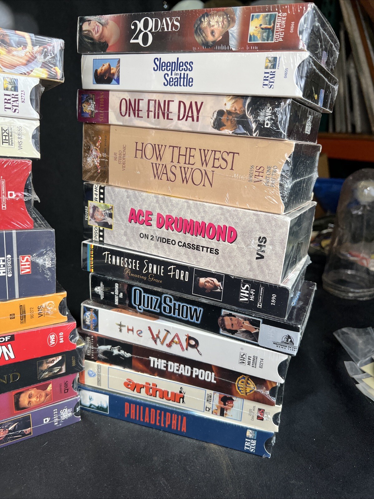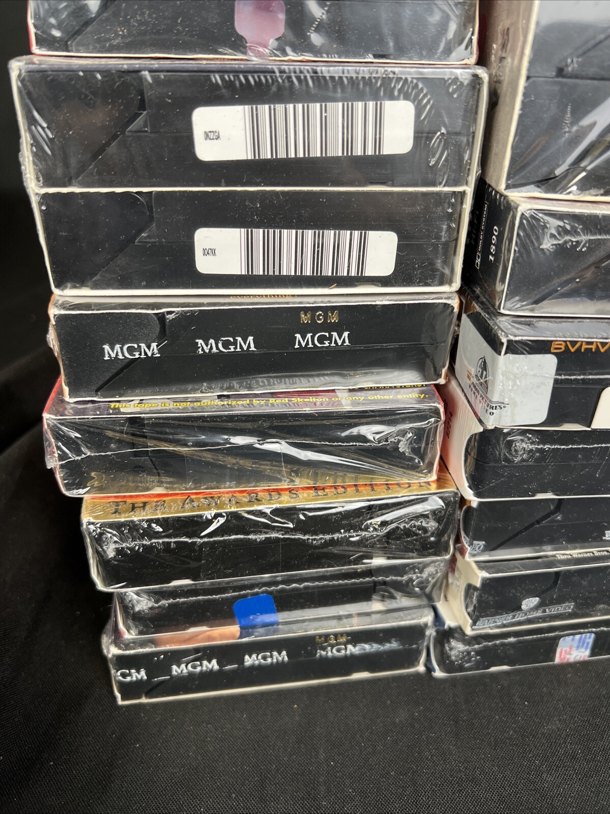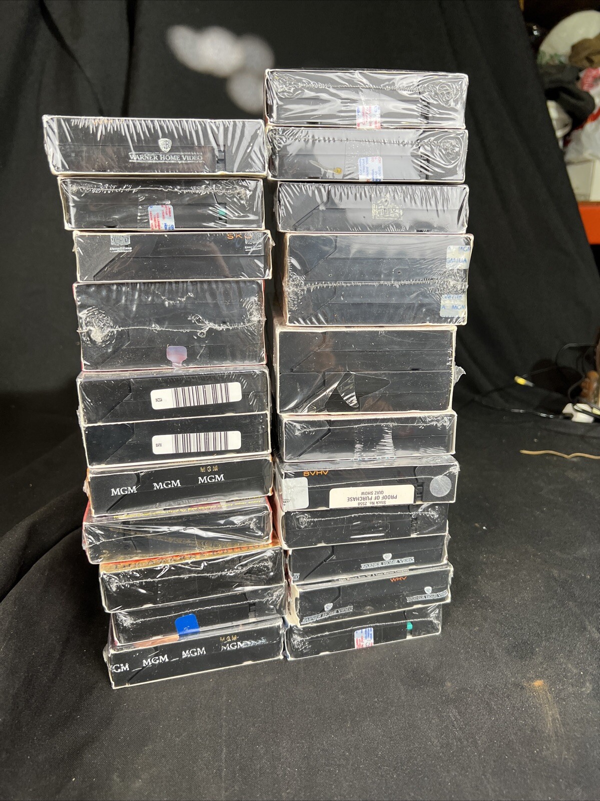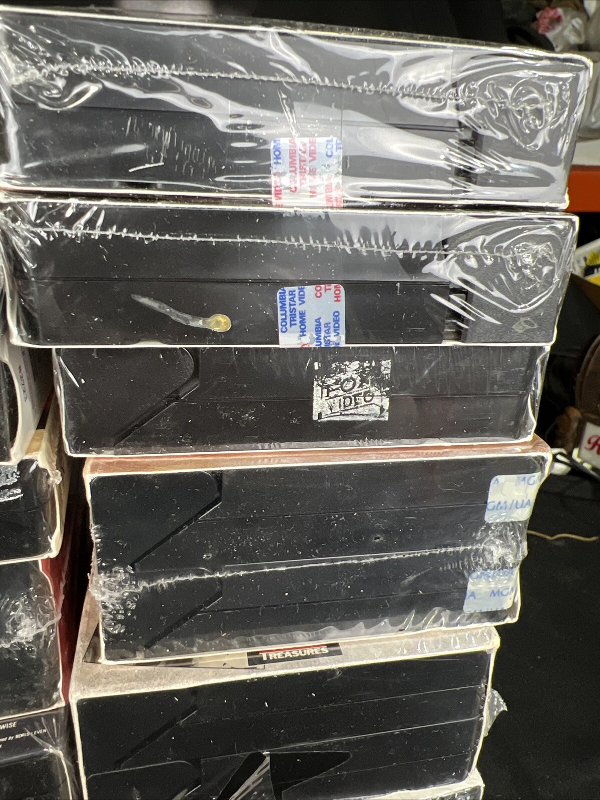 I believe these all to be factory sealed. The original cellophane look pretty good on most of these. I’m not super familiar with VHS wraps, but the internal tabs look good as well. There is a little bit of cellophane coming off on a couple of them. There are four that are double VHS packs. All are sealed, and you get all 21 shown.