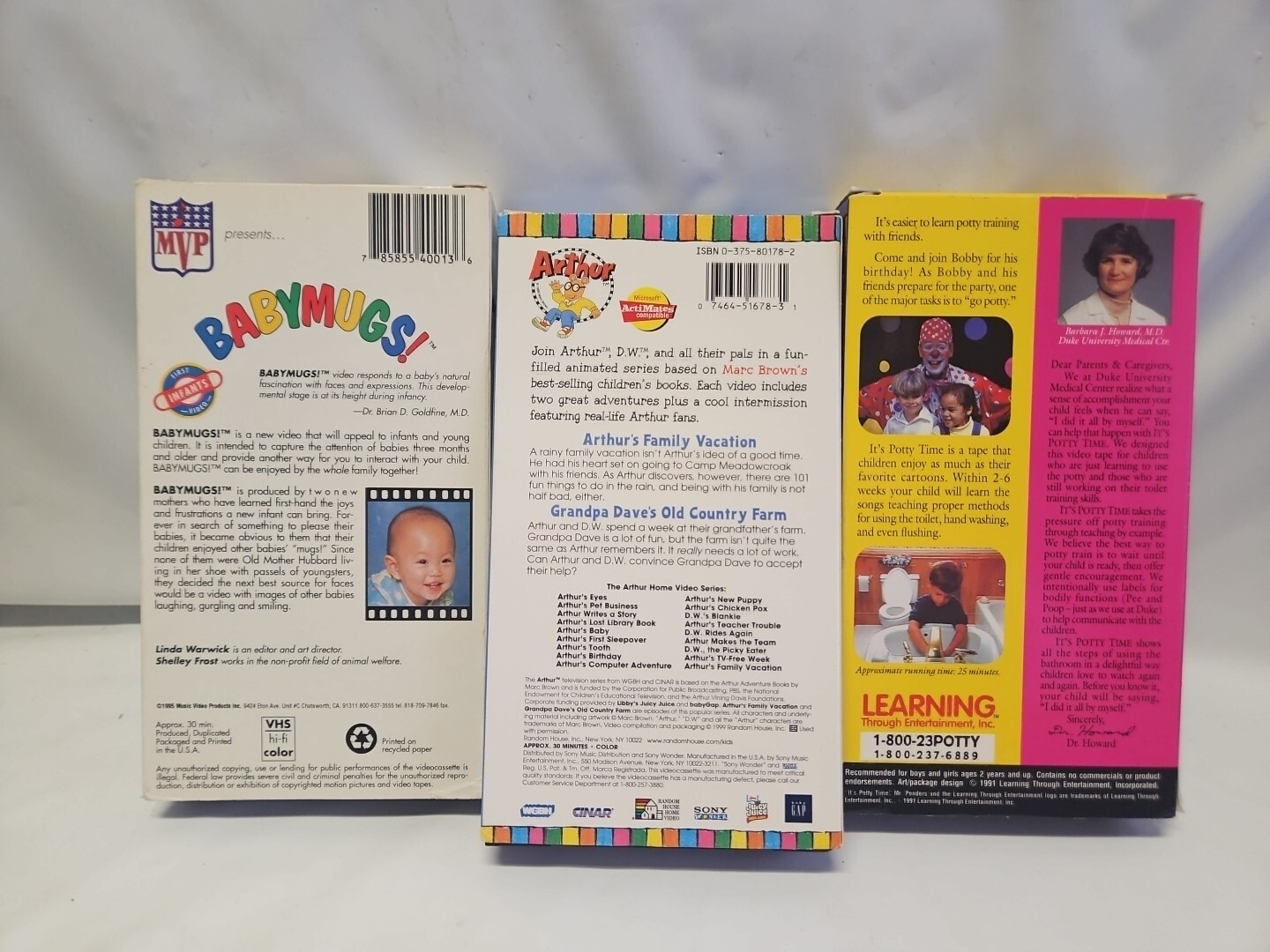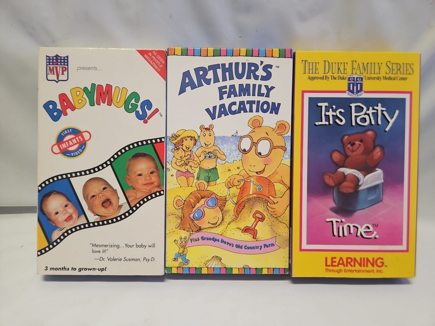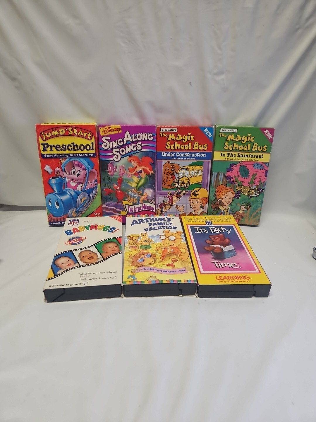 This lot includes various VHS tapes featuring popular TV shows like Magic School Bus and Arthur's Potty Time. The tapes are perfect for fans of the shows who want to relive their childhood memories. The collection includes the Jump Start Arthur's Potty Time Baby Mugs, which adds an extra touch of nostalgia to the set.