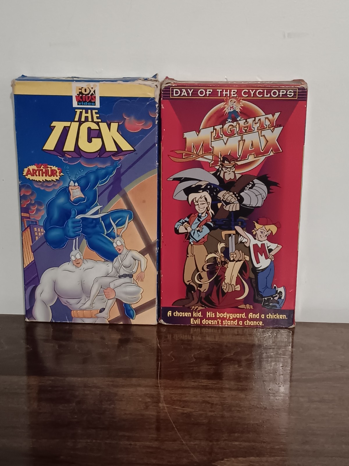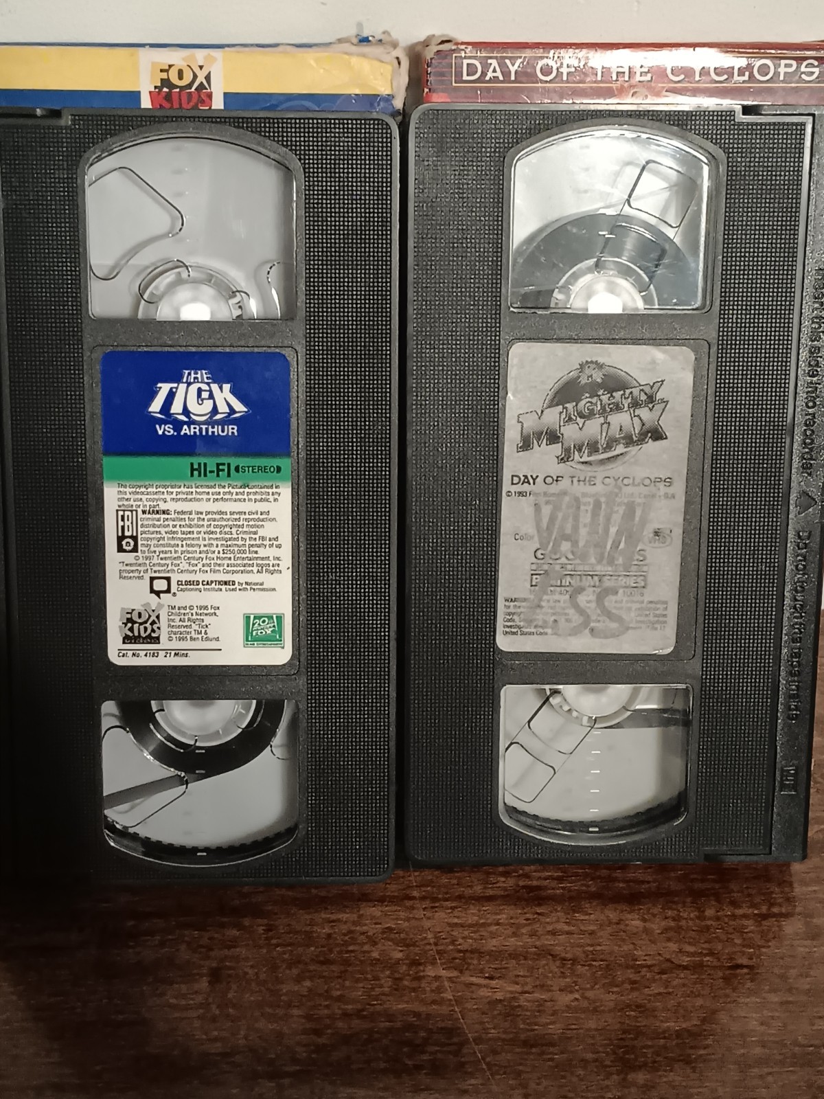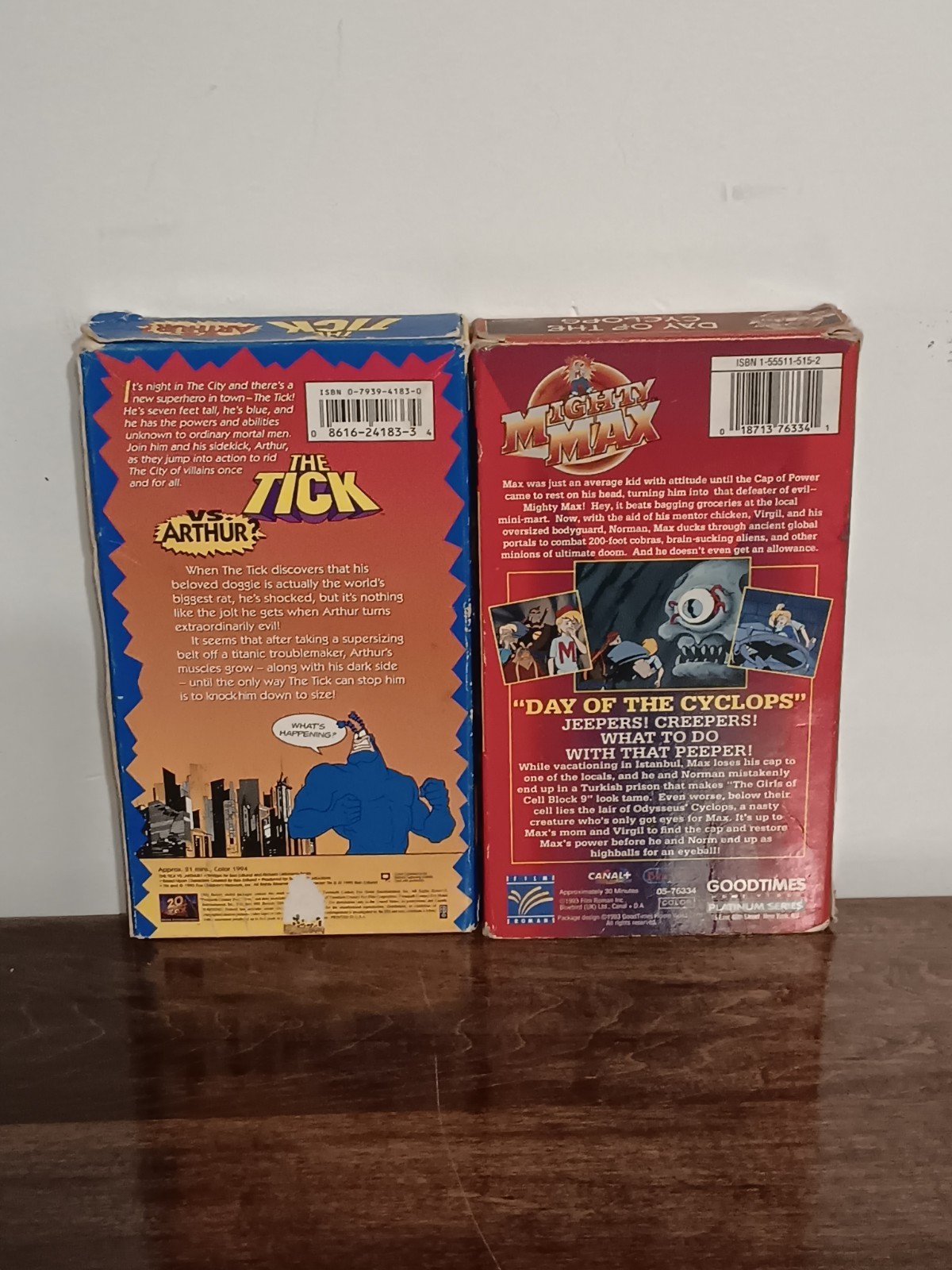 This VHS bundle features two rare titles, "The Tick Vs. Arthur" and "Mighty Max: Day of The Cyclops." Both tapes are in English with NTSC signal standard and are not former rentals. The animation/anime genre TV shows included in this lot are sure to be collector's items for fans of these cult classics. Made in the United States, these VHS tapes offer a nostalgic viewing experience for fans of '90s animation and comedy.