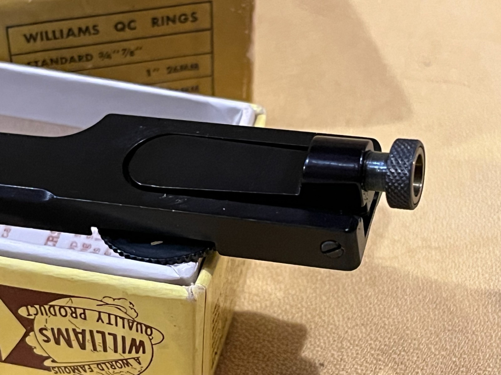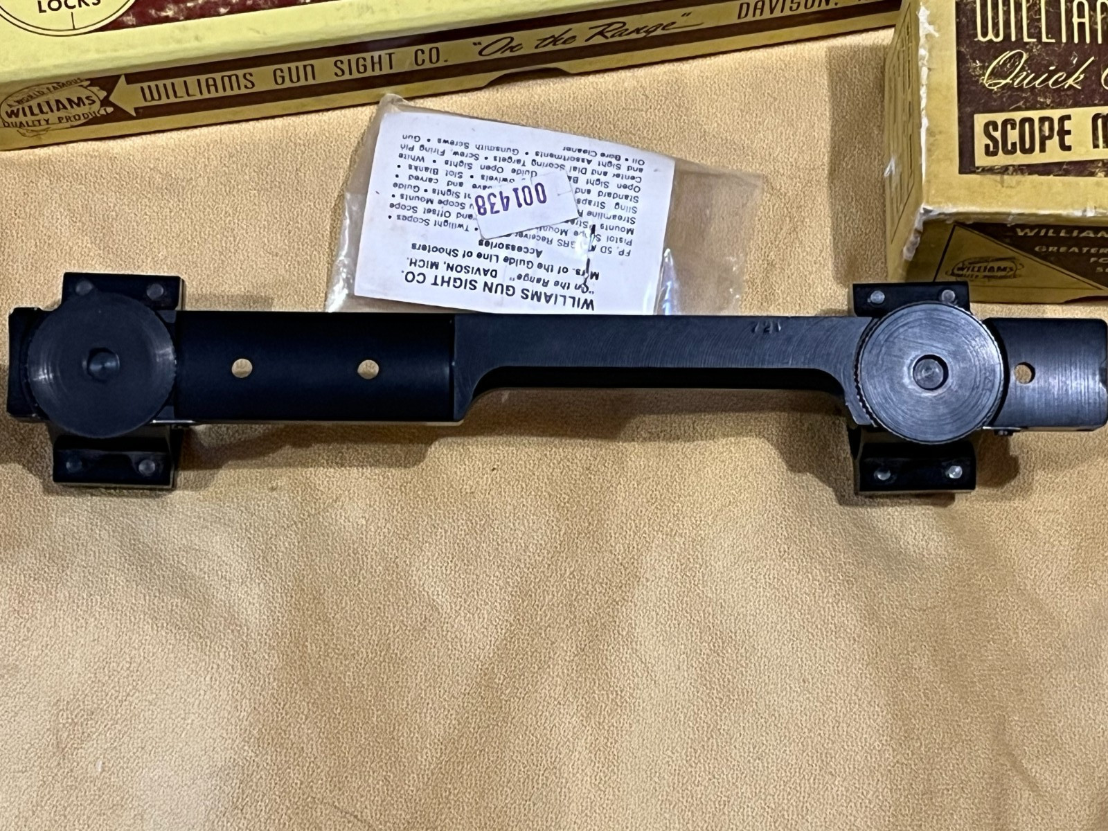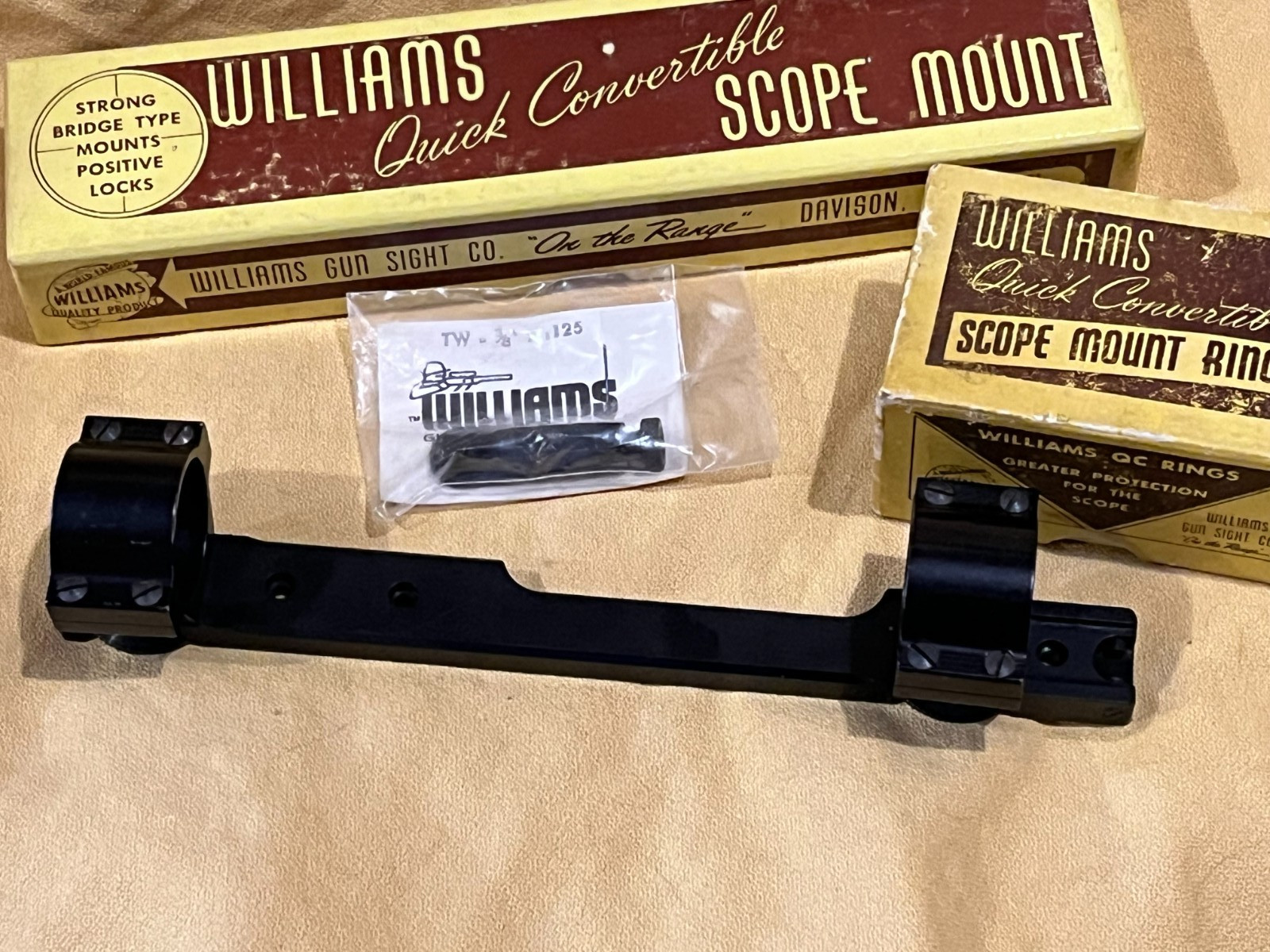 A complete Williams Quick Convertible base, 1" QC rings and an removable rear Quick Peep sight set for all long action Remington model 721 and 700, as well as, numerous cross-listed rifles including Ruger 77ST, Weatherby MkV, and S&W Howa. The Quick Peep slots into the rear in place of the rings for emergency use with the scope removed. The Williams Quick Convertible allows removal of the rings and scope with no torque using straight stem vertical thumb wheel nuts. The base has 22 mm front hole pair and rear/front hole to the single rear is 113 mm. A nice practical upgrade with a good scope for one of these classic hunting rifles. WINNING BIDDER NOTE: I