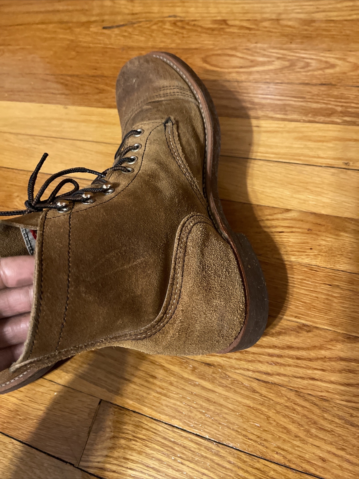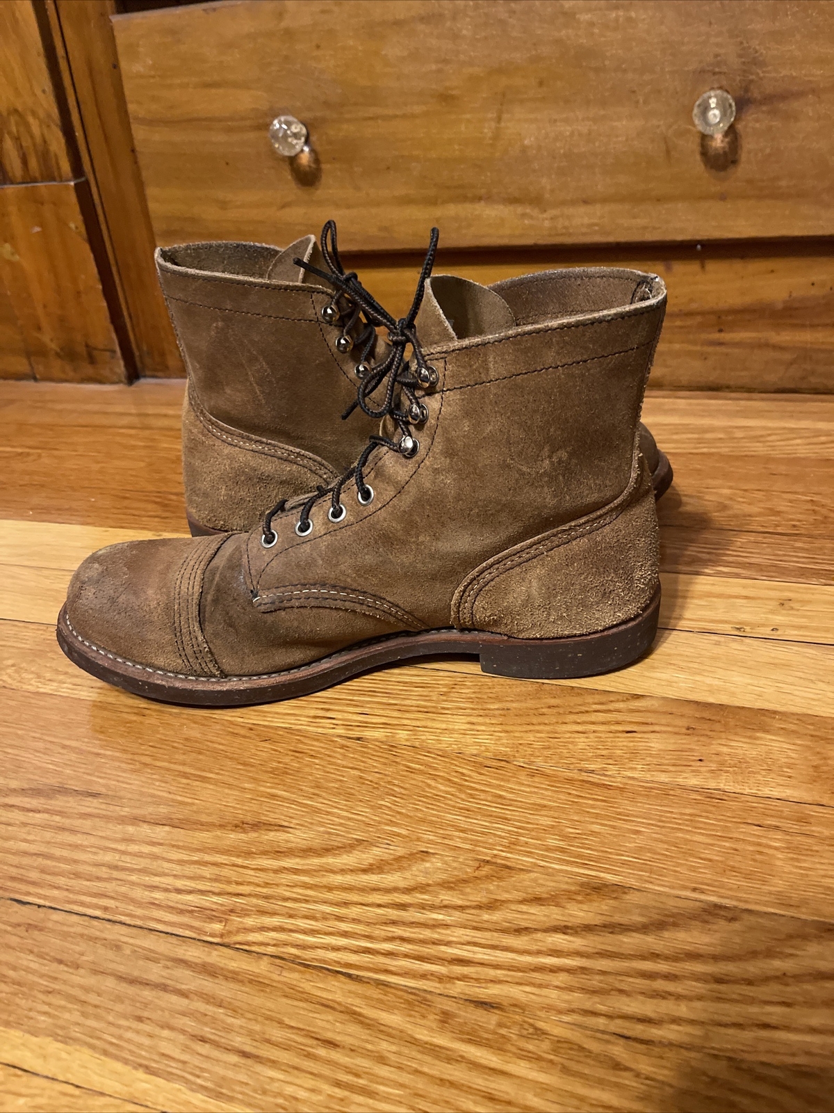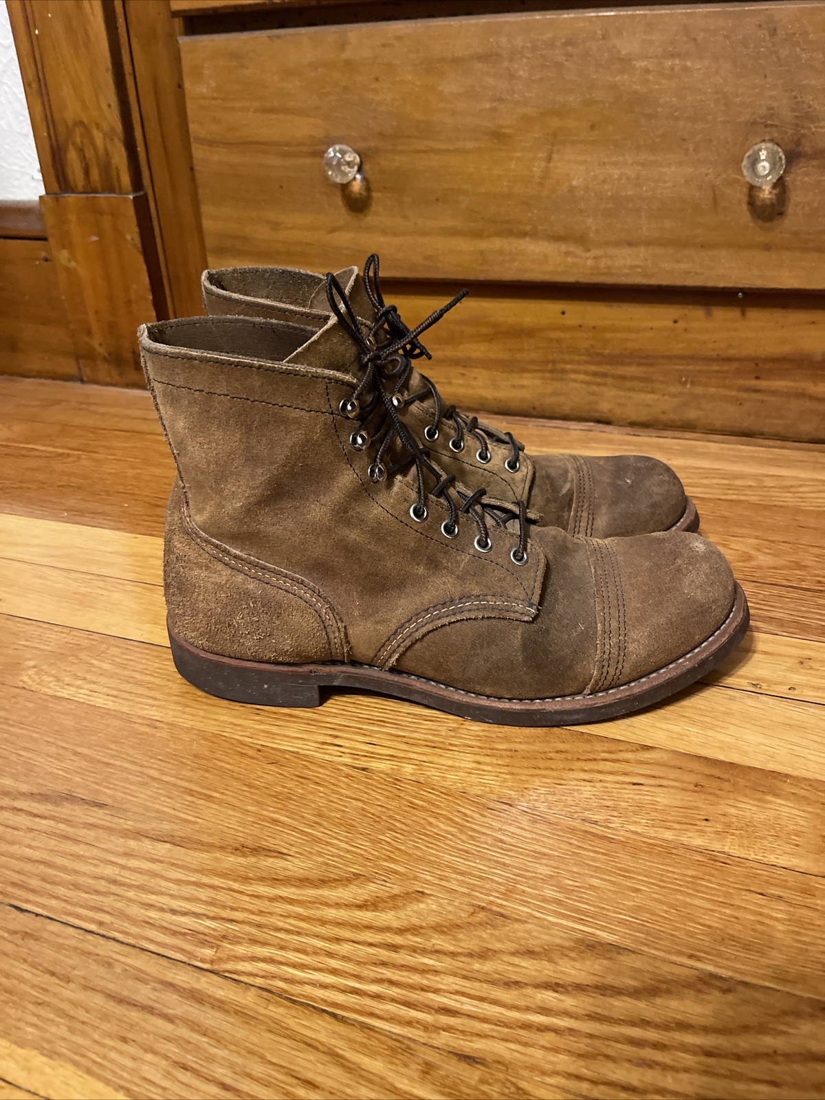 The Red Wing Shoes 6" Iron Ranger boots are made in the USA and are constructed with high-quality leather. They feature a lace-up closure and ankle shaft style, ensuring a secure fit and comfortable feel. These boots are perfect for any casual occasion, whether you're going for a hike or just running errands.conditions is pre owned and the boots has sign of wear, see the pictures for detailed condition of the boots, Shipped with USPS priority mail.(80)
