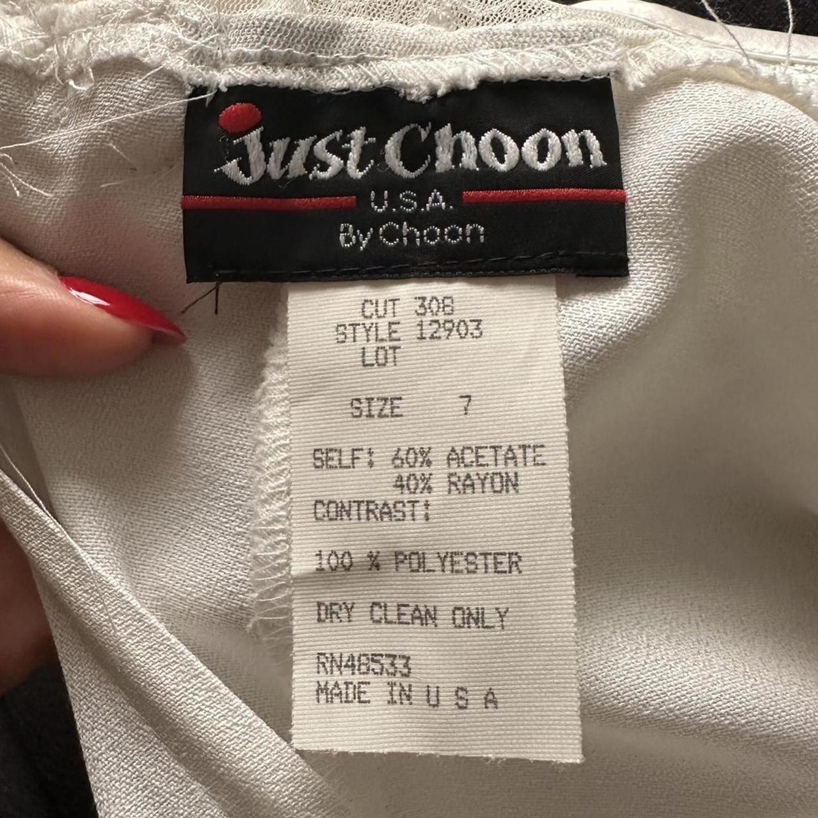 688. Just Choon true vintage white mini dress with lace top. Ties in the back and has rose detailing above invisible zipper. Perfect for a bride. Labeled a size 7, fits like a small