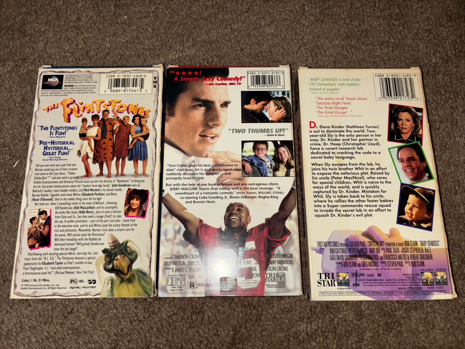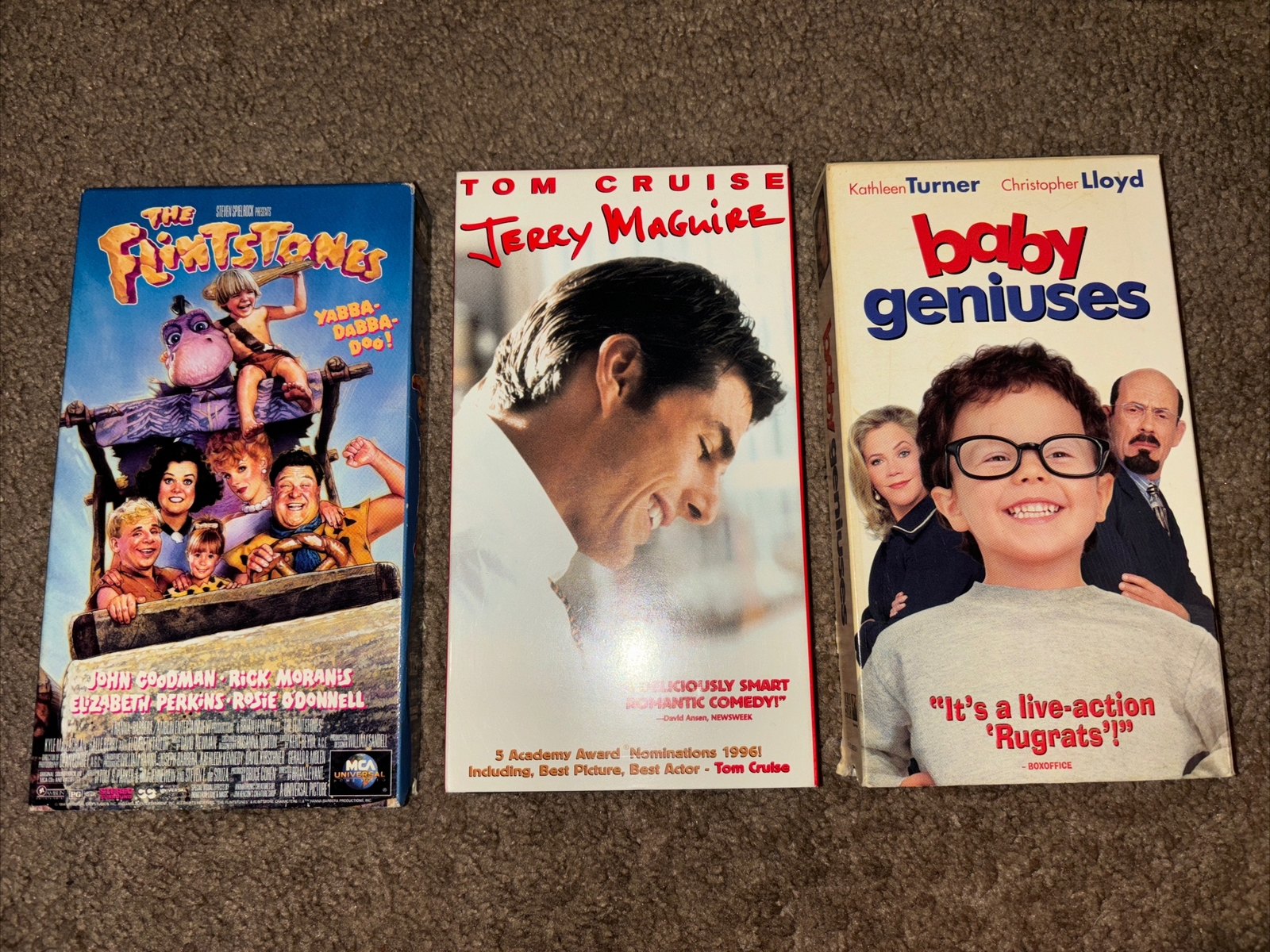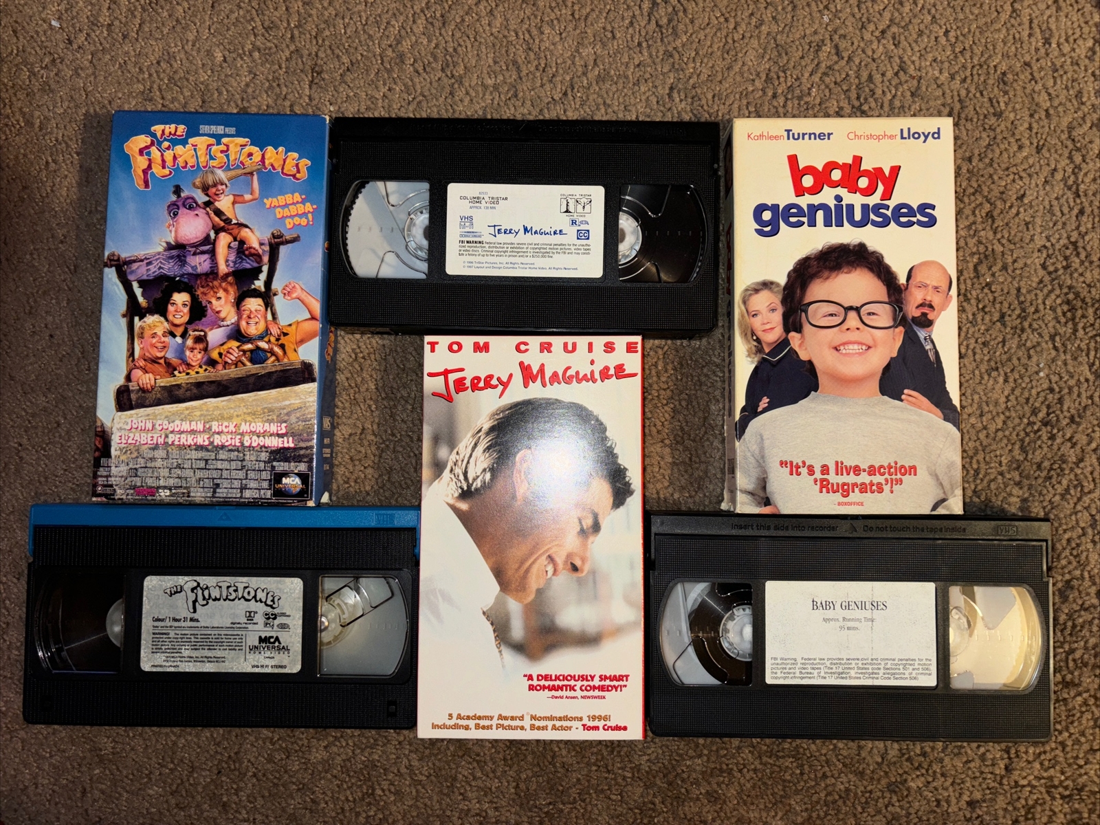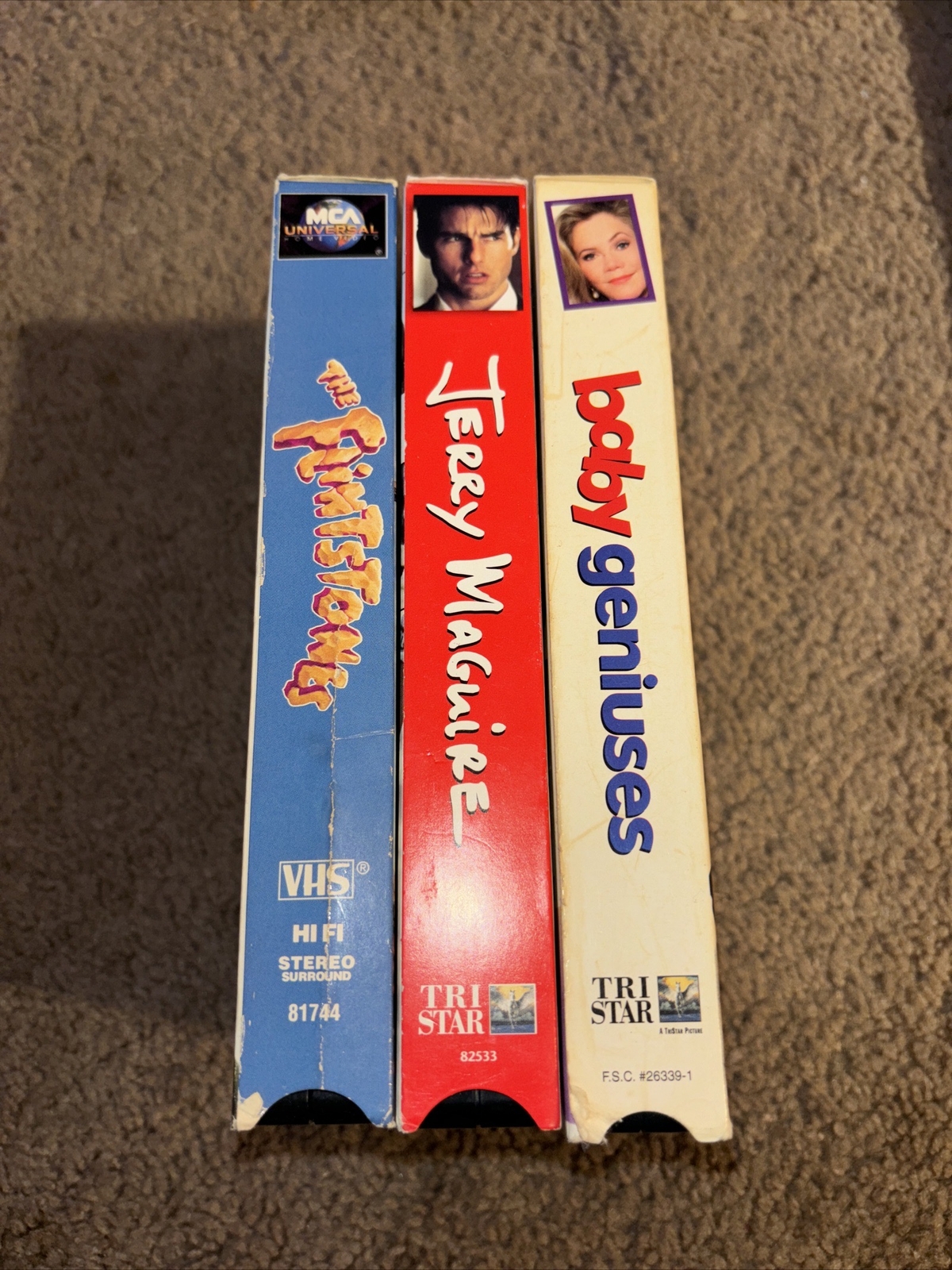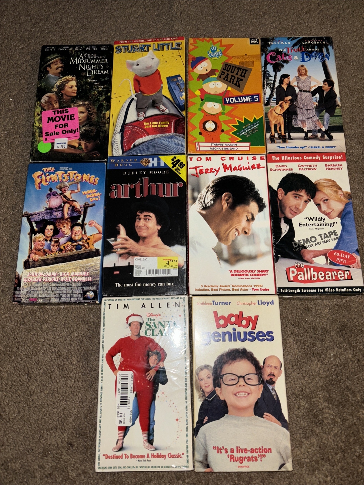 This is a lot of ten vintage VHS comedy movies in good condition. The collection includes The Flintstones, Jerry Maguire, Arthur, and others. The movies feature a range of famous actors, including Uma Thurman, Tom Cruise, and Gwyneth Paltrow, and cover a variety of genres, such as action, adventure, fantasy, family, romance, and teen.