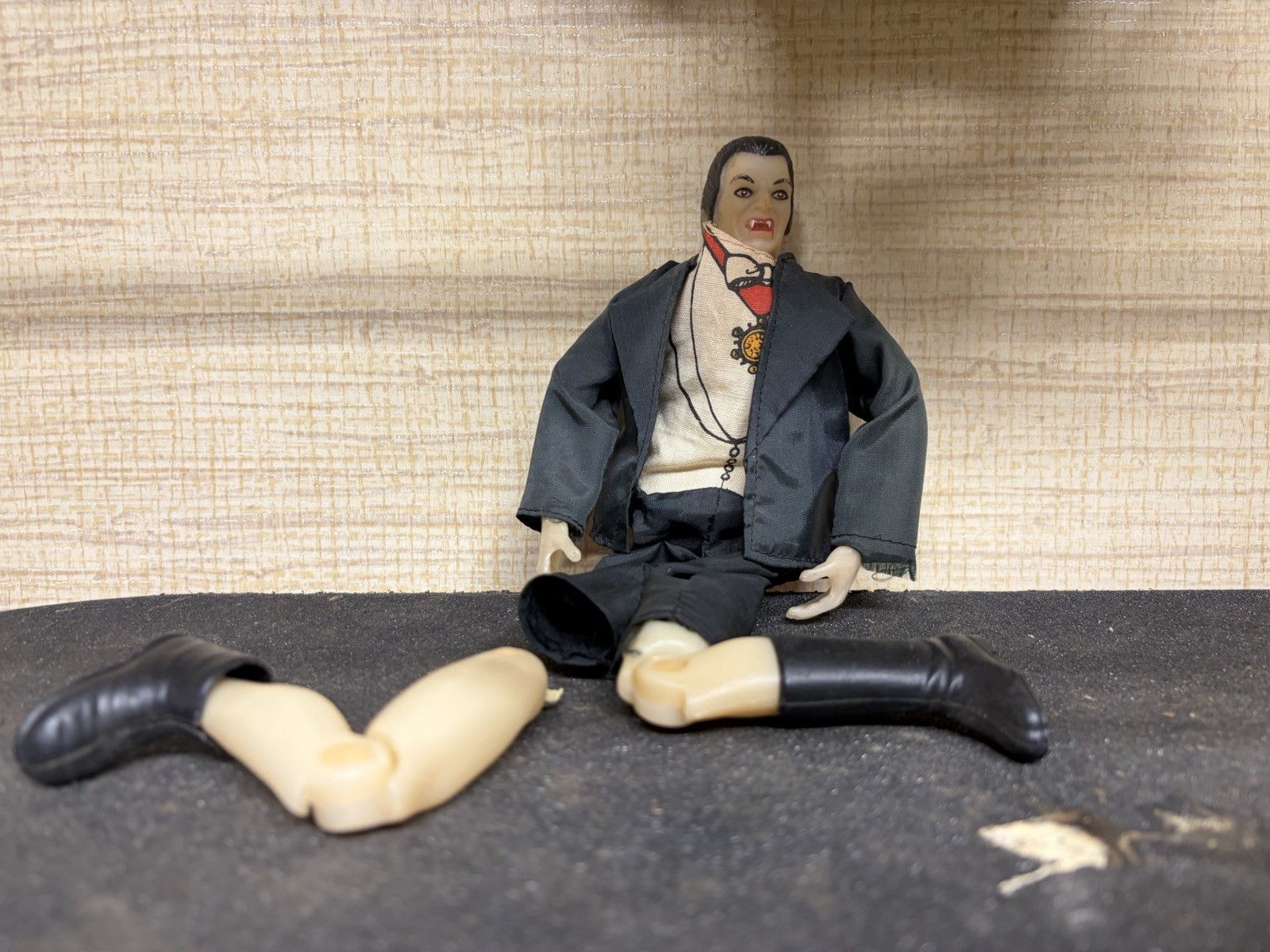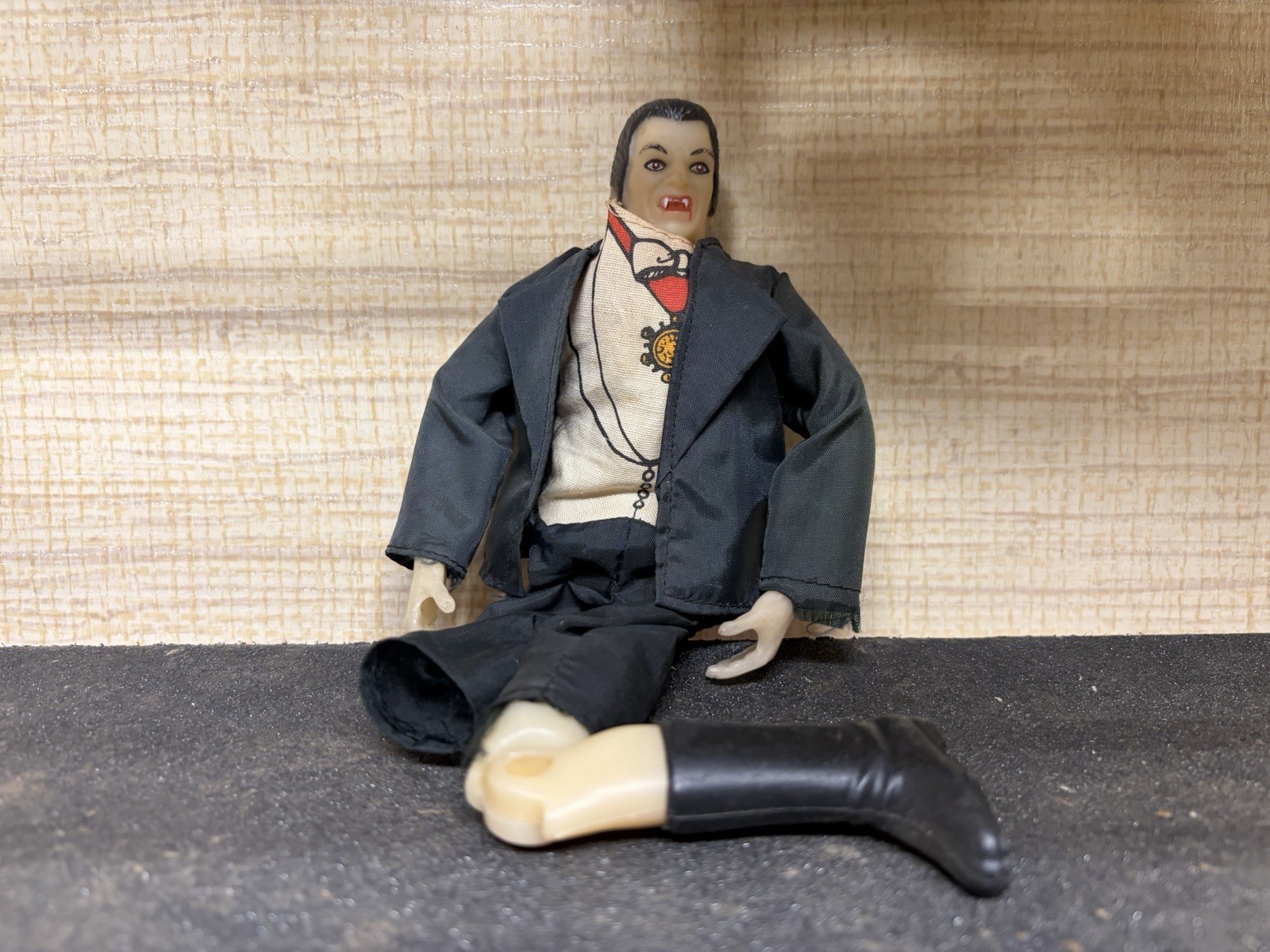 The Vintage Glow In the Dark Dracula toy by Remco is a rare find for collectors of monster-themed toys. Featuring a unique glow-in-the-dark design, this Dracula figure is sure to be a standout piece in any collection. With its retro charm and tie-in to the classic monster theme, this toy is a must-have for fans of all things spooky and nostalgic. Leg is detached . Cape missing
