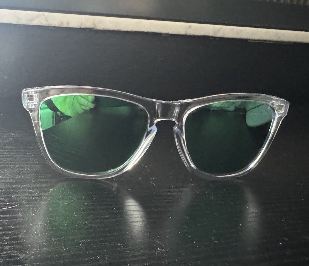 The Oakley OO9013-D655 55 Green Mirrored Sleek Frogskins Sunglasses are stylish unisex sunglasses with a sleek sport wrap design. They feature translucent clear frames with mirrored UV polycarbonate lenses in a grayish violet tone. With a 139mm temple length and made of plastic, these sunglasses are a fashionable and functional accessory for the modern individual. Made in the United States, these Oakley sunglasses offer both quality and a trendy design for any outdoor activity.