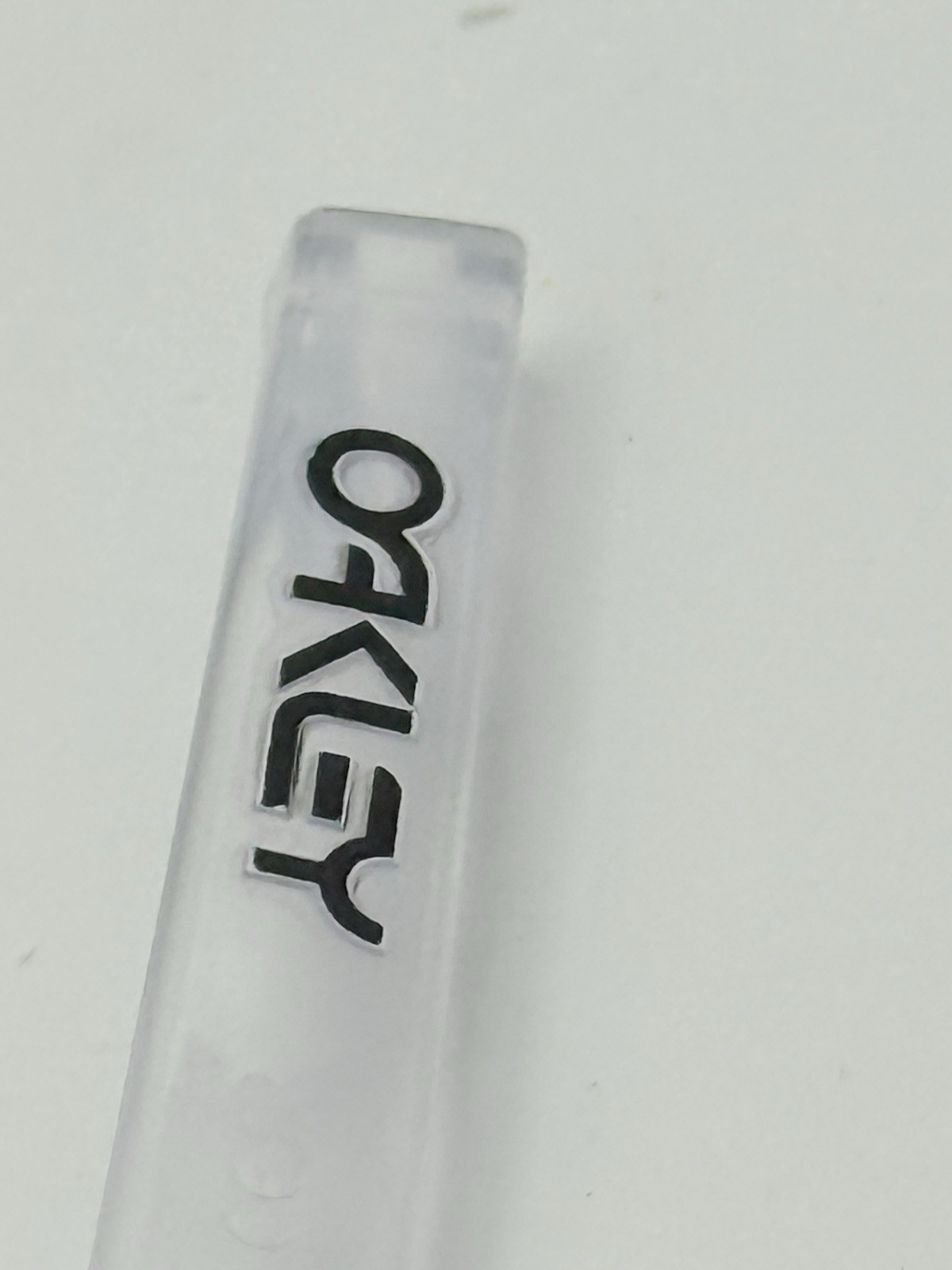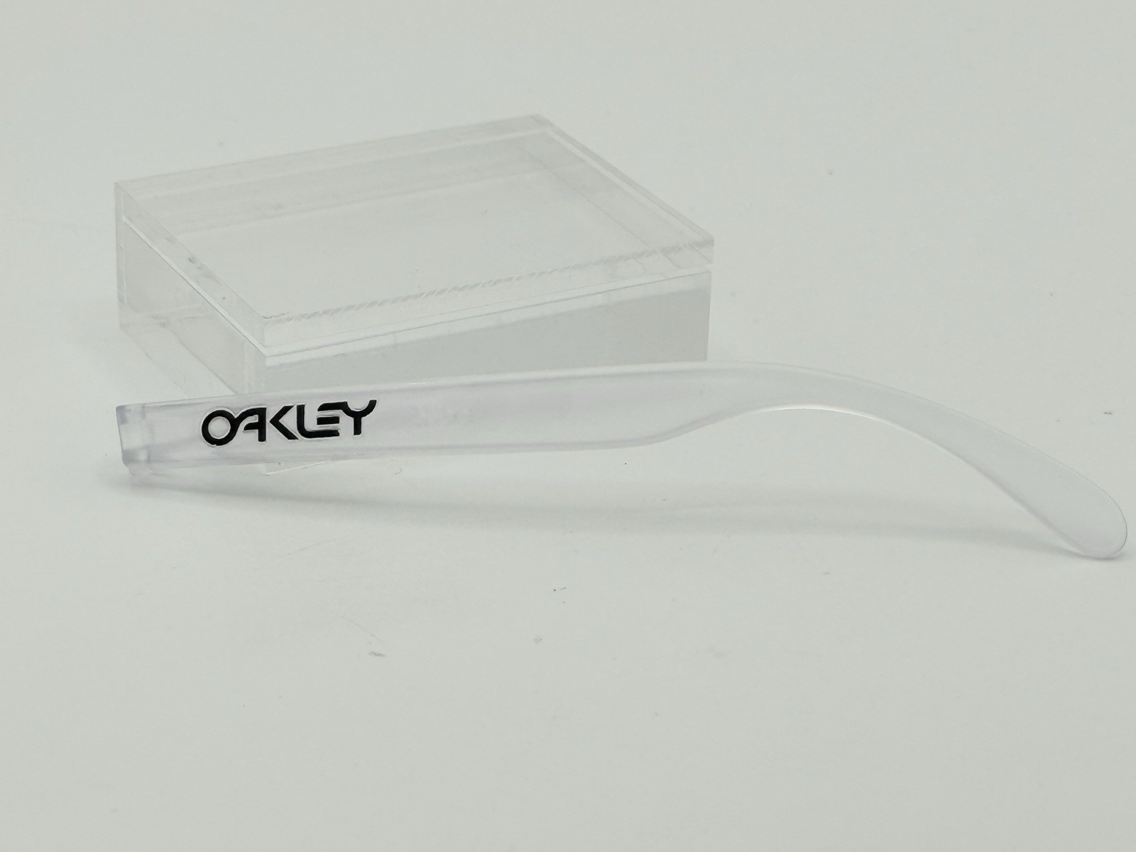 The product is a replacement left temple arm for Oakley Frogskins sunglasses in matte clear color. This authentic Oakley part is designed specifically for men and features a black icon theme. The clear lens color adds a stylish touch to the classic Oakley Frogskins model, ensuring a perfect fit and sleek design for your sunglasses. Perfect for those looking to replace a broken or damaged temple arm on their Oakley Frogskins sunglasses.